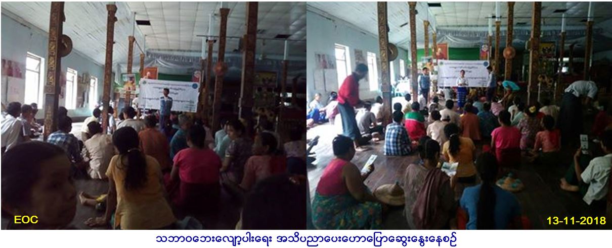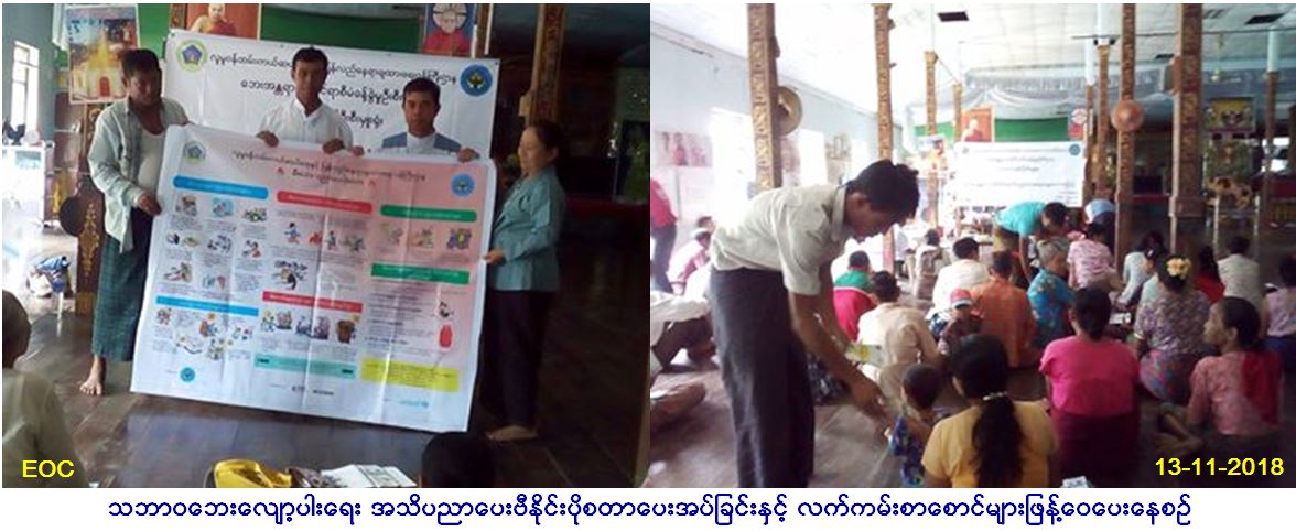 လူမှုဝန်ထမ်း၊ ကယ်ဆယ်ရေးနှင့် ပြန်လည်နေရာချ ထားရေးဝန်ကြီးဌာန၊ ဘေးအန ္တရာယ်ဆိုင်ရာ စီမံခန့်ခွဲမှုဦးစီးဌာန၊ ဟသာၤတခရိုင်ဦးစီးမှူ းရုံးမှ တာဝန်ရှိသူများသည် (၁၃-၁၁-၂၀၁၈)ရက်နေ့၊ နံနက်(၁၀:၃၀)အချိန်တွင် လေးမျက်နှာမြို့နယ်၊ ဒေါင့်ကြီးအုပ်စုအတွင်းရှိ ကျေးရွာခွဲ(၆)ရွာမှ ပြည်သူ(၅၆)ဦးအား သဘာဝဘေးလျော့ပါးရေး အသိပညာပေးဟောပြောပွဲပြုလုပ်ခဲ့ပြီး သဘာဝဘေးအသိပညာပေးလက်ကမ်းစာစောင်များဖြန့်ဝေပေးခြင်းနှင့် ကျေးရွာအုပ်ချုပ်ရေးမှူးထံသို့ ဗွီနိုင်းပိုစတာများပေးအပ်ခဲ့ကြောင်း သတင်းရရှိပါသည်။
