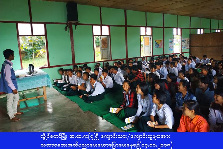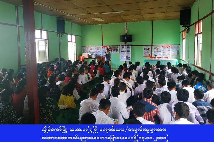 လူမှုဝန်ထမ်း၊ ကယ်ဆယ်ရေးနှင့် ပြန်လည်နေရာချ ထားရေးဝန်ကြီးဌာန၊ ဘေးအန္တရာယ်ဆိုင်ရာစီမံ ခန့်ခွဲမှုဦးစီးဌာန၊ ကယားပြည်နယ်ဦးစီးမှူးရုံးမှ တာဝန်ရှိသူများသည် (၁၄.၁၁.၂၀၁၈)ရက်နေ့တွင် (၁၄း၀၀)နာရီအချိန်မ ှ(၁၅း၀၀)နာရီအထိ လွိုင်ကော်မြို့နယ်၊ အ.ထ.က(၇)ကျောင်းရှိ ကျောင်းသား/ ကျောင်းသူ(၂၀၀)ဦးအား သဘာဝဘေး အသိပညာပေးဟောပြောဆွေးနွေးခဲ့ပြီး လက်ကမ်းစာစောင်များဖြန့်ဝေပေးခဲ့ကြောင်း သတင်းရရှိပါသည်။