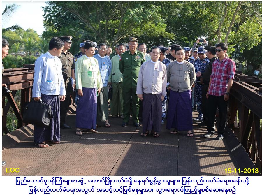 လူဝင်မှုကြီးကြပ်နှင့် ပြည်သူ့အင်အားဝန်ကြီး ဌာန ပြည်ထောင်စုဝန်ကြီး ဦးသိန်းဆွေ၊ လူမှုဝန်ထမ်း၊ ကယ်ဆယ်ရေးနှင့်ပြန်လည်နေရာချထားရေးဝန်ကြီးဌာန ပြည်ထောင်စု ဝန်ကြီး ဒေါက်တာဝင်းမြတ်အေး၊ ရခိုင်ပြည်နယ် ဝန်ကြီးချုပ် ဦးညီပု၊ ပြန်လည်လက် ခံရေး၊ ပြန်လည်နေရာချထားရေးလုပ်ငန်းကော်မတီ ဥက္ကဌများဖြစ်ကြသော ဒုတိယဝန်ကြီးများ၊ ရခိုင်ပြည်နယ်အစိုးရအဖွဲ့ဝင်ဝန်ကြီးများနှင့် ဌာနဆိုင်ရာတာဝန်ရှိသူများသည် ယနေ့မွန်းလွဲ ၂ နာရီ က စစ်တွေမြို့မှ တောင်ပြိုလက်ဝဲရှိ ပြည်လည်လက်ခံရေးစခန်းသို့ နေရပ်စွန့်ခွာ သူများ ပြန်လည်လက်ခံရေး အတွက် ကြိုတင်ပြင် ဆင်ဆောင်ရွက်မှုအခြေအနေများအား သွားရောက်ကြည့်ရှုစစ်ဆေးကြသည်။