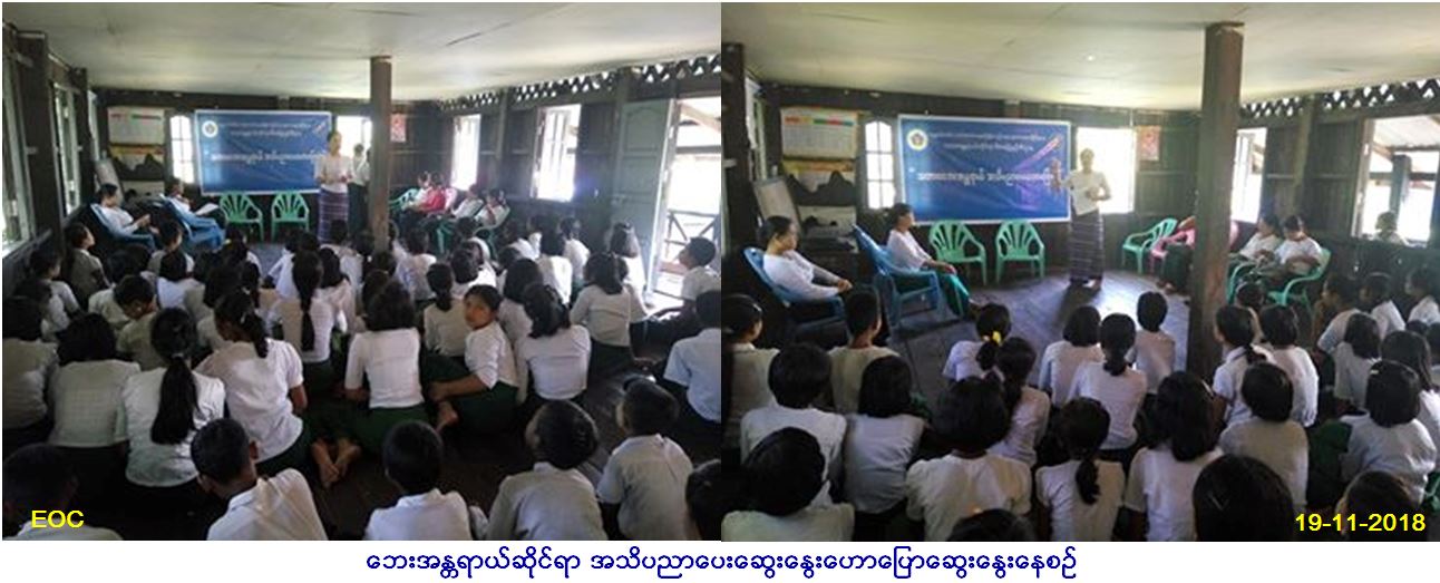 လူမှုဝန်ထမ်း၊ ကယ်ဆယ်ရေးနှင့် ပြန်လည်နေရာချထားရေးဝန်ကြီးဌာန၊ ဘေးအန္တရာယ်ဆိုင်ရာစီမံခန့်ခွဲမှုဦးစီးဌာန၊ ဘေးအန္တရာယ်ဆိုင်ရာစီမံခန့့် ခွဲမှုဦးစီးဌာန၊ ကျောက်ဖြူခရိုင်ဦးစီးမှူးရုံးမှ တာဝန်ရှိသူများသည် (၁၉.၁၁.၂၀၁၈)ရက်နေ့ (၁၄း၀၀)မှ(၁၅း၀၀)ထိ ကျောက်ဖြူမြို့၊ တောင်ရင်း (အ.လ.က)၌ ဆရာ/ဆရာမများ၊ ကျောင်းသူ/သားများ စုစုပေါင်း (၁၀၀) ဦးကျော်အား ဘေးအန္တရာယ်ဆိုင်ရာအသိ ပညာပေးဆွေးနွေးဟောပြောဆွေးနွေးခဲ့ပါသည်၊၊ အဆိုပါ ဆွေးနွေးပွဲတွင် ဘေးမဖြစ်မီကြိုတင်ပြင် ဆင်ရေး၊ ဘေးဖြစ်စဉ်တုံ့ပြန်ဆောင်ရွက်ရေးနှင့် ဘေးဖြစ်ပြီး ဆောင်ရန်/ရှောင်ရန်များပြောကြားခြင်း၊ လက်ကမ်းစာစောင်များဝေငှပေးခြင်းများ၊ မုန့်များဖြန့်ဝေပေးခြင်းများ ဆောင်ရွက်ခဲ့ကြောင်း သတင်းရရှိပါသည်။
