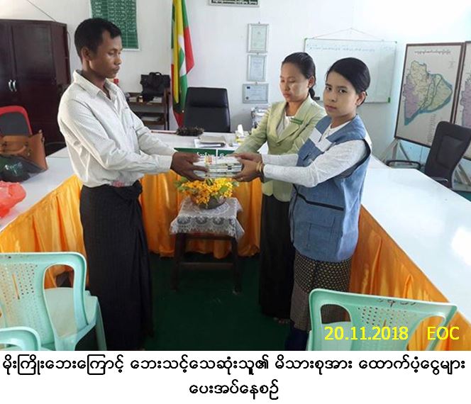 လူမှုဝန်ထမ်း၊ ကယ်ဆယ်ရေးနှင့် ပြန်လည်နေရာချထားရေးဝန်ကြီးဌာန၊ ဘေးအန္တရာယ်ဆိုင်ရာ စီမံခန့်ခွဲမှုဦးစီးဌာန၊ ဖျာပုံခရိုင်ဦးစီးမှူးရုံးမှ တာဝန်ရှိသူများသည် ဧရာဝတီတိုင်းဒေသကြီး၊ ဒေးဒရဲမြို့နယ်၊ သောကြာကျေးရွာအုပ်စု၊ ဂွေးကုန်းကျေးရွာပင်လယ်သောင်၌ (၁၄-၁၀-၂၀၁၈) ရက်နေ့၊ (၁၄း၀၀) နာရီအချိန်ခန့်တွင် ဖြစ်ပွားခဲ့သော မိုးကြိုးဘေးကြောင့် ဘေးသင့်သေဆုံးသူ ဦးဆန်းထွန်း (၅၂) နှစ်အတွက် ထောက်ပံ့ငွေ (၃၀၀,၀၀၀/-) ကျပ်ကို ၎င်း၏သားဖြစ်သူအား သက်ဆိုင်ရာတာဝန်ရှိသူများ၏ ရှေ့မှောက်၌ (၂၀-၁၁-၂၀၁၈) ရက်နေ့တွင် သွားရောက် ထောက်ပံ့ပေးအပ်ခဲ့ပါကြောင်း သတင်းရရှိပါသည်။