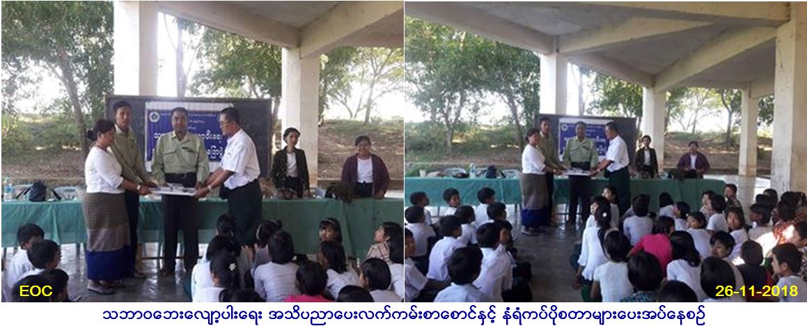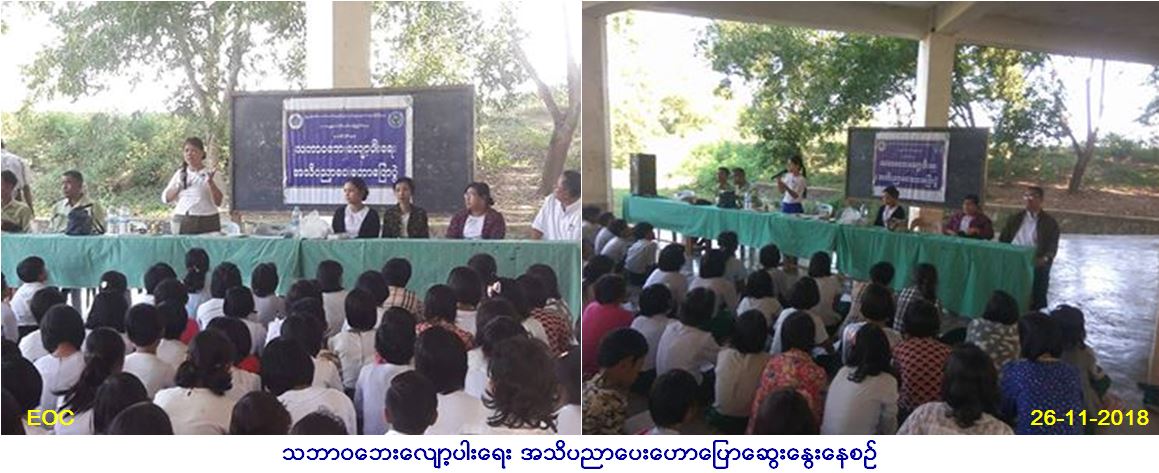 လူမှုဝန်ထမ်း၊ ကယ်ဆယ်ရေးနှင့် ပြန်လည်နေရာချ ထားရေးဝန်ကြီးဌာန၊ ဘေးအန္တရာယ်ဆိုင်ရာ စီမံခန့်ခွဲမှုဦးစီးဌာန၊ ဧရာဝတီတိုင်းဒေသကြီး၊ ဖျာပုံခရိုင်ဦးစီးမှူးရုံးမှ တာဝန်ရှိသူများသည် နိုဝင်ဘာလ(၂၆)ရက်နေ့တွင် ဖျာပုံမြို့နယ်၊ ဒေါ်ညိမ်းကျေးရွာအုပ်စု၊ ဒေါ်ညိမ်းကျေးရွာ အထက ကျောင်းတွင် (၁၃:၀၀)နာရီမှ (၁၅:၀၀)နာရီအထိ ကျောင်းသား၊ ကျောင်းသူများနှင့်ဆရာ၊ ဆရာမ စုစုပေါင်း (၈၀၀)ဦးအား သဘာဝဘေး လျော့ပါးရေးအသိပညာပေးဟောပြောဆွေးနွေးခဲ့ပြီး လက်ကမ်းစာစောင်နှင့် နံရံကပ်ပိုစတာ များဖြန့်ဝေပေးခဲ့ကြောင်း သတင်းရရှိပါသည်။