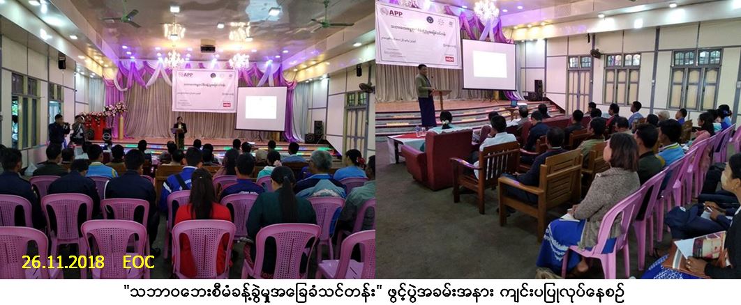 လူမှုဝန်ထမ်း၊ ကယ်ဆယ်ရေးနှင့် ပြန်လည်နေရာချထားရေးဝန်ကြီးဌာန၊ ဘေးအန္တရာယ်ဆိုင်ရာ စီမံခန့်ခွဲမှုဦးစီးဌာန၊ ကသာခရိုင်ဦးစီးမှူးရုံးမှ တာဝန်ရှိသူများသည် ကသာခရိုင် သဘာဝဘေးအန္တရာယ်ဆိုင်ရာ စီမံခန့်ခွဲမှုကော်မတီ၏ ကြီးကြပ်မှုဖြင့် စစ်ကိုင်းတိုင်းဒေသကြီး၊ ကသာခရိုင်၊ ကသာမြို့၊ ကြိုက်ခန်းမ၌ မြန်မာသဘာဝဘေးအန္တရာယ်ဆိုင်ရာ ကြိုတင်ပြင်ဆင်ရေးမိတ်ဖက်အဖွဲ့၊ Myanmar Preparedness Partnership (MPP) ၏ ကသာခရိုင်အတွင်းလုပ်ငန်းစဉ်ပထမနေ့အဖြစ် (၂၆-၁၁-၂၀၁၈) ရက်နေ့တွင် “သဘာဝဘေးစီမံခန့်ခွဲမှုအခြေခံသင်တန်း” ဖွင့်ပွဲအား ကျင်းပပြုလုပ်ခဲ့ပြီး သင်တန်းသား/သူ (၃၀) ဦးတက်ရောက်ခဲ့ပါကြောင်း သတင်းရရှိပါသည်။