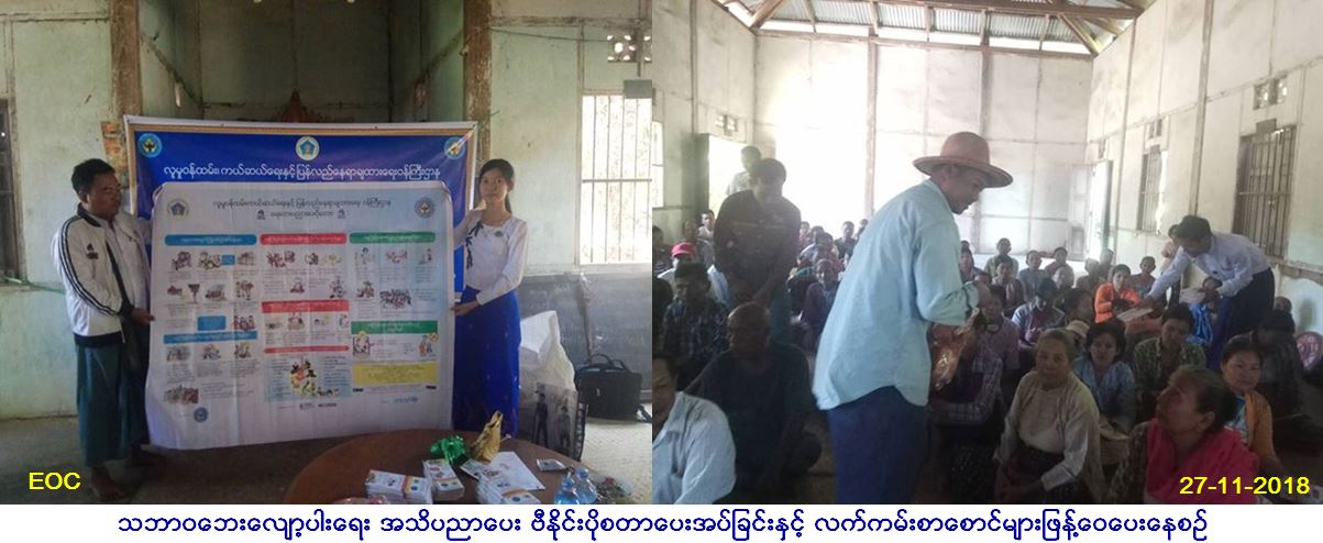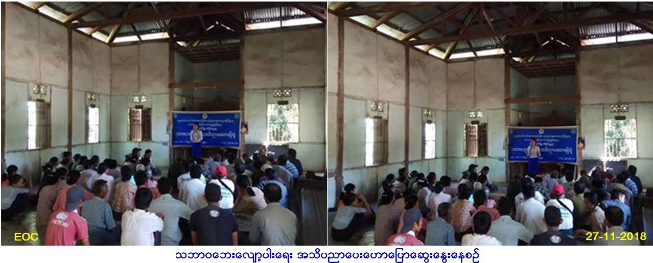 လူမှုဝန်ထမ်း၊ ကယ်ဆယ်ရေးနှင့် ပြန်လည်နေရာ ချထားရေးဝန်ကြီးဌာန၊ ဘေးအန္တရာယ်ဆိုင်ရာစီမံ ခန့်ခွဲမှုဦးစီးဌာန၊ ပန်းတောင်းမြို့နယ်ဦးစီးမှူး ရုံးမှ တာဝန်ရှိသူများသည် (၂၇.၁၁.၂၀၁၈)ရက်နေ့ နံနက်(၁၀း၃၀)နာရီအချိန်မှ (၁၁း၃၀)နာရီအချိန်အထိ ပန်းတောင်းမြို့နယ်၊ ကိုင်းကြီး ကျေးရွာအုပ်စု ကိုင်းကြီးကျေးရွာ ဘုန်းတော်ကြီးကျောင်းဓမ္မာရုံတွင် လူဦးရေ (၁၂၀)ဦးအား သဘာဝဘေးလျော့ပါးရေး အသိပညာပေး ဟောပြောဆွေးနွေးခဲ့ပြီး လက်ကမ်းစာစောင်များနှင့် ခေါက်ဆွဲခြောက် များဝေငှပေးခဲ့ကြောင်းနှင့် ကျေးရွာအုပ်ချုပ်ရေးမှူး ထံသို့ ဗီနိုင်းပိုစတာ ပေးအပ်ခဲ့ကြောင်း သတင်း ရရှိပါသည်။