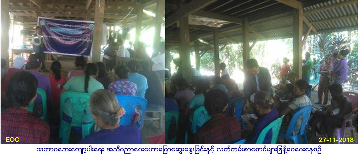 လူမှုဝန်ထမ်း၊ ကယ်ဆယ်ရေးနှင့် ပြန်လည်နေရာချ ထားရေးဝန်ကြီးဌာန၊ ဘေးအန္တရာယ်ဆိုင်ရာစီမံ ခန့်ခွဲမှုဦးစီးဌာန၊ ကျောက်ဖြူခရိုင်ဦးစီးမှူးရုံးမှ တာဝန်ရှိသူများသည် (၂၇.၁၁.၂၀၁၈)ရက်နေ့တွင် သံတွဲမြို့၊ အံတော်ကျေးရွာတွင် ကျေးရွားအုပ်ချုပ်ရေးမှူးနှင့် အရပ်သူ/အရပ်သား (၁၁၀)ဦး အား သဘာဝဘေးအသိ ပညာပေးဟောပြောဆွေးနွေးခဲ့ပြီး လက်ကမ်းစာစောင်များဖြန့်ဝေပေးခဲ့ကြောင်း သတင်းရရှိပါသည်။