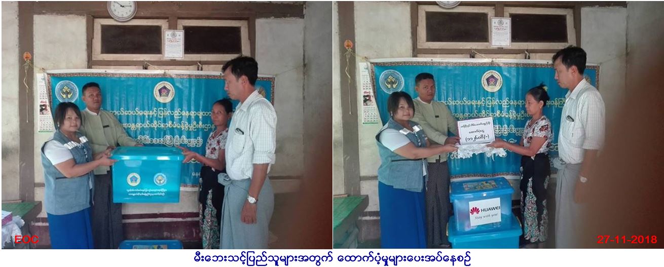 လူမှုဝန်ထမ်း၊ ကယ်ဆယ်ရေးနှင့် ပြန်လည်နေရာ ချထားရေးဝန်ကြီးဌာန၊ ဘေးအန္တရာယ်ဆိုင်ရာစီမံ ခန့်ခွဲမှုဦးစီးဌာန၊ ပဲခူးတိုင်းဒေသကြီးဦးစီးမှူး ရုံးမှ တာဝန်ရှိသူများသည်(၂၅-၁၁-၂၀၁၈) ရက်နေ့ဖြစ်ပွားသော ပဲခူးခရိုင်၊ ဒိုက်ဦးမြို့နယ်၊ ဖအောင်းစုကျေးရွာအုပ်စု၊ ကြာအင်းကျေးရွာမီးဘေး သင့် အိမ်(၁)လုံးအတွက် အိမ်ဆောက် ပစ္စည်းဖိုး(၁)သိန်း၊ လူဦးရေ (၆)ဦးအတွက် ဆန်ဖိုး(၁၂၆၀၀/-)ကျပ် စုစုပေါင်း(၁၁၂၆၀၀/-)ကျပ်နှင့် ကယ်ဆယ်ရေးပစ္စည်း (၁၉)မျိုး၊ family kit တစ်ပုံးတို့အား (၂၇-၁၁-၂၀၁၈)ရက်နေ့တွင် သွားရောက်ထောက်ပံ့ပေးအပ်ခဲ့ကြောင်း သတင်း ရရှိပါသည်။
