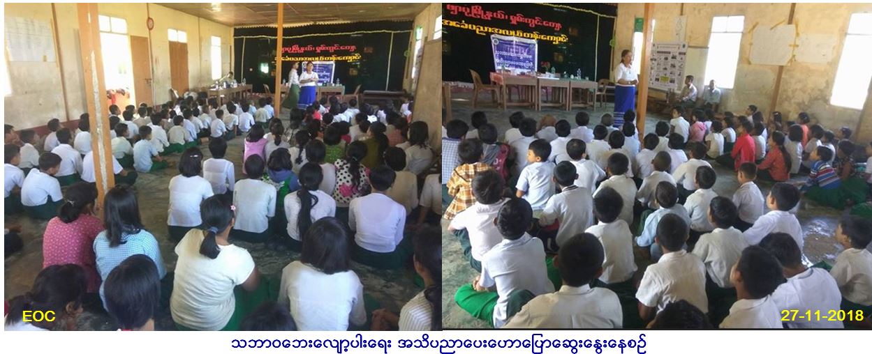 လူမှုဝန်ထမ်း၊ ကယ်ဆယ်ရေးနှင့် ပြန်လည်နေရာ ချထားရေးဝန်ကြီးဌာန၊ ဘေးအန္တရာယ်ဆိုင်ရာ စီမံခန့်ခွဲမှုဦးစီးဌာန၊ ဧရာဝတီတိုင်းဒေသကြီး၊ ဖျာပုံခရိုင်ဦးစီးမှူးရုံးမှ တာဝန်ရှိသူများသည် နိုဝင်ဘာလ(၂၇)ရက်နေ့တွင် ဖျာပုံမြို့နယ် အထွေထွေအုပ်ချုပ်ရေးဦးစီးဌာန၊ မြို့နယ် အခြေခံပညာ ဦးစီးဌာနတို့နှင့်ပူးပေါင်း၍ ဖျာပုံမြို့နယ်၊ ကျုံတာကျေးရွာအုပ်စု၊ ရှမ်းကွင်းကျေးရွာ အ.လ.က ကျောင်းတွင် (၁၀း၀၀)နာရီမှ (၁၂း၀၀)နာရီအထိ သဘာဝဘေးလျော့ပါးရေးအသိပညာပေးဟောပြောပွဲကျင်းပပြုလုပ်ခဲ့ရာ ကျောင်းသား၊ ကျောင်းသူများနှင့် ဆရာ၊ ဆရာမစုစုပေါင်း (၂၀၀)ဦးမှ စိတ်ပါဝင်စား စွာတက်ရောက်၍ အသိပညာဗဟုသုတပေးနိုင်ခဲ့ပြီး လက်ကမ်းစာစောင်နှင့် နံရံကပ်ပိုစတာ များဖြန့်ဝေပေးခဲ့ကြောင်း သတင်းရရှိပါသည်။