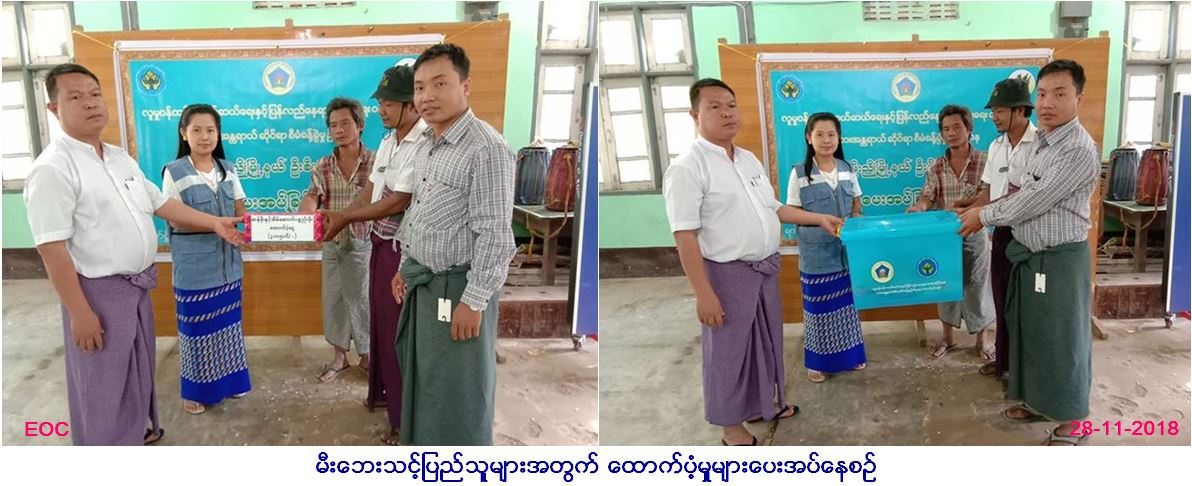 လူမှုဝန်ထမ်း၊ ကယ်ဆယ်ရေးနှင့် ပြန်လည်နေရာချ ထားရေးဝန်ကြီးဌာန၊ ဘေးအန္တရာယ်ဆိုင်ရာစီမံ ခန့်ခွဲမှုဦးစီးဌာန၊ မိုးညိုမြို့နယ်ဦးစီးမှူးရုံးမှ တာဝန်ရှိသူများသည် (၂၅-၁၁-၂၀၁၈)ရက်နေ့ (၁၄း၄၅)နာရီအချိန်၌ ပဲခူးတိုင်းဒေသကြီး၊ သာယာဝတီခရိုင်၊ မိုးညိုမြို့နယ်၊ သာယာကုန်း ကျေးရွာအုပ်စု၊ ဥယျာဉ်စုကျေးရွာတွင် ဖြစ်ပွားခဲ့သော မီးဘေးမှ မီးဘေးသင့်နေအိမ်(၂)လုံးတို့အတွက် အိမ်ဆောက်ပစ္စည်းဖိုးထောက်ပံ့ငွေ (၃၀၀,၀၀၀/-)ကျပ်၊ အိမ်ထောင်စု(၂)စုရှိ လူဦးရေ(၅)ဦးတို့အတွက် ဆန်ရိက္ခာဖိုးထောက်ပံ့ငွေ (၁၀,၅၀၀/-)ကျပ်၊ စုစုပေါင်းထောက်ပံ့ငွေ (၃၁၀,၅၀၀/-)ကျပ်နှင့် ကယ်ဆယ်ရေးပစ္စည်း(၁၈)မျိုး (ပလပ်စတစ်ပုံးအပါ)(၂)အိမ်ထောင်စာ၊ တန်ဖိုးငွေ(၇၆,၄၃၂/-)ကျပ်အား (၂၈-၁၁-၂၀၁၈)ရက်နေ့ (၁၄း၀၀)နာရီအချိန်၌ မိုးညိုမြို့နယ်အထွေထွေအုပ်ချုပ်ရေးဦးစီးဌာနရုံးတွင် မြို့နယ်အထွေထွေအုပ်ချုပ်ရေးရုံးမှ တာဝန်ရှိ သူများ၊ သက်ဆိုင်ရာကျေးရွာအုပ်ချုပ်ရေးမှူးနှင့်အတူ ပြည်သူလက်ဝယ်အရောက် ထောက်ပံ့ပေး အပ်ခဲ့ပါကြောင်း သတင်းရရှိပါသည်။