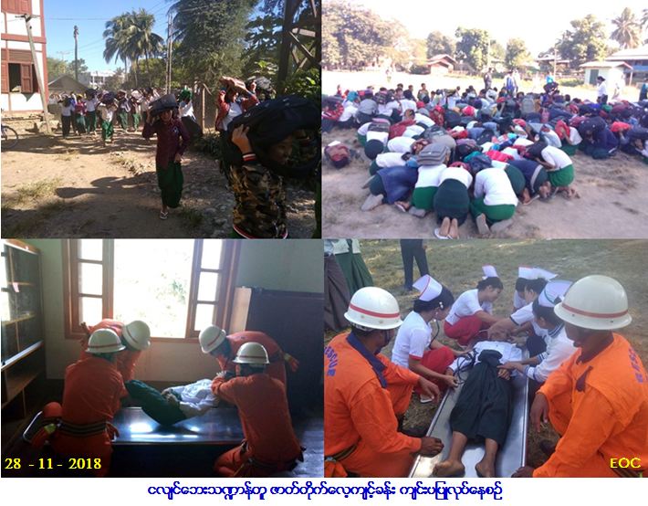 လူမှုဝန်ထမ်း၊ ကယ်ဆယ်ရေးနှင့် ပြန်လည်နေရာချထားရေးဝန်ကြီးဌာန၊ ဘေးအန္တရာယ်ဆိုင်ရာစီမံခန့်ခွဲမှုဦးစီးဌာန၊ ဂန့်ဂေါခရိုင် ဦးစီးမှူးရုံးမှ တာဝန်ရှိသူများသည် ခရိုင်/မြို့နယ်အဆင့် သဘာဝဘေးအန္တရာယ်ဆိုင်ရာ စီမံခန့်ခွဲမှုကော်မတီနှင့် ဌာနဆိုင်ရာများ ပူးပေါင်း၍ (၂၈-၁၁-၂၀၁၈) ရက်နေ့၊ (၁၄း၀၀) အချိန်မှ (၁၅း၃၀) နာရီအချိန်ထိ ငလျင်ဘေးသဏ္ဍာန်တူ ဇာတ်တိုက်လေ့ကျင့် ခန်းကျင်းပပြုလုပ်ခဲ့ရာ ကျောင်းသား/သူနှင့် ဆရာ/ဆရာမ (၆၀၈) ဦးနှင့် ဌာနဆိုင်ရာမှ (၂၈) ဦး စုစုပေါင်း (၆၃၆) ဦး တက်ရောက်ခဲ့ကြောင်း သတင်းရရှိပါသည်။