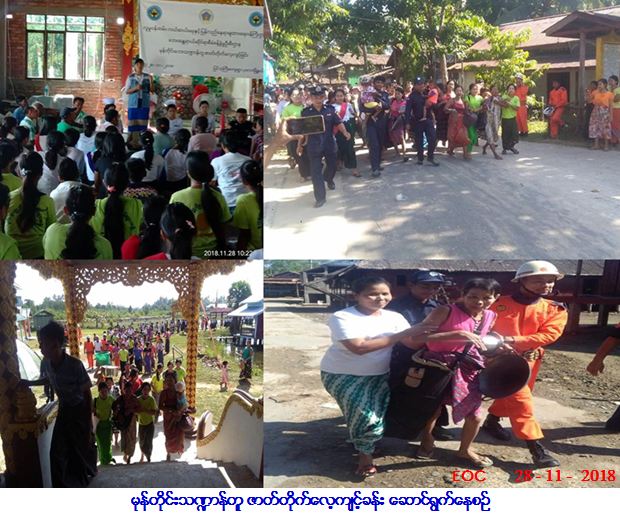 လူမှုဝန်ထမ်း၊ ကယ်ဆယ်ရေးနှင့် ပြန်လည်နေရာချထားရေးဝန်ကြီးဌာန၊ ဘေးအန္တရာယ်ဆိုင်ရာစီမံခန့်ခွဲမှုဦးစီးဌာန၊ မြိတ်ခရိုင် ဦးစီးမှူးရုံးမှ တာဝန်ရှိသူများသည် (၂၈-၁၁-၂၀၁၈) ရက်နေ့၊ (၀၉း၀၀) နာရီအချိန်တွင် ပုလောမြို့နယ်၊ ပြင်ဘုကြီးကျေးရွာ၌ မီးသတ်တပ်ဖွဲ့၊ ကျေးရွာအုပ်ချုပ်ရေးအဖွဲ့၊ ကျေးရွာကြက်ခြေနီတပ်ဖွဲ့၊ ကျန်းမာရေးဦးစီးဌာန၊ အရန်မီးသတ်တပ်ဖွဲ့ဝင်များ၊ ပရဟိတ အဖွဲ့များနှင့် ကျေးရွာသူ/ကျေးရွာသားများ စုစုပေါင်း လူဦးရေ (၂၅၀) ဦးပါဝင်လျက် မုန်တိုင်းဘေးသဏ္ဍာန်တူ ဇာတ်တိုက် လေ့ကျင့်ခန်းကိုဆောင်ရွက်ခဲ့ပြီး တက်ရောက်လာသူများအား ထမင်းဘူး၊ ရေသန့်နှင့် လက်ကမ်းစာစောင်များ ဝေငှပေးခဲ့ကြောင်း သတင်းရရှိပါသည်။