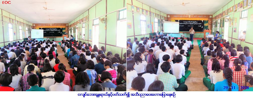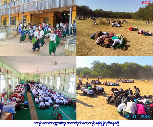လူမှုဝန်ထမ်း၊ ကယ်ဆယ်ရေးနှင့်ပြန်လည်နေရာချထားရေးဝန်ကြီးဌာန၊ ဘေးအန္တရာယ်ဆိုင်ရာစီမံခန့်ခွဲမှုဦးစီးဌာန မကွေးတိုင်း ဒေသကြီးဦးစီးမှူးရုံးမှ တာဝန်ရှိသူများသည် (၂၉-၁၁-၂၀၁၈) ရက်နေ့ (၁၃း၀၀) နာရီအချိန်တွင် မကွေးမြို့၊ အထက (၃) အစည်းအဝေး ခန်းမတွင် ငလျင်ဘေးအန္တရာယ်နှင့်ပတ်သက်၍ ဟောပြောခြင်းကို တိုင်းဒေသကြီးဦးစီးမှူးမှလည်းကောင်း၊ ငလျင်လှုပ်နေစဉ် ဘေးကင်းစွာ နေထိုင်နည်းကို ကြက်ခြေနီတပ်ဖွဲ့မှ အုပ်ချုပ်ရေးအရာရှိ ဦးညီညီဇေမှလည်းကောင်း ဟောပြောခဲ့ရာ ဆရာ/ဆရာမများ၊ ကျောင်းသား/ ကျောင်းသူများ စုစုပေါင်း (၇၀၀) ဦး တက်ရောက်ခဲ့ပါသည်။ ထို့နောက် (၁၄း၀၀) နာရီတွင် ငလျင်ဘေးသဏ္ဍာန်တူဇာတ်တိုက် လေ့ကျင့်ခြင်း ကိုဆောင်ရွက်ခဲ့ရာ အန္တရာယ်ကင်းစုဝေးရပ်သို့ ဆရာ/ဆရာမများ၊ ကြက်ခြေနီတပ်ဖွဲ့တို့၏ ကြီးကြပ်မှုဖြင့် ရွှေ့ပြောင်းခြင်း၊ အကာအကွယ် ယူခြင်း၊ ဒဏ်ရာရကျောင်းသား/ကျောင်းသူများကို ရှေးဦးသူနာပြုစုကုသခြင်း၊ အရေးပေါ်လူနာများအား ညွှန်းပို့ခြင်းတို့ကို အစီအစဉ်အတိုင်း ဆောင်ရွက်ခဲ့ပါကြောင်းနှင့် သဘာဝဘေးလက်ကမ်းစာစောင်များကိုလည်း ဖြန့်ဝေပေးခဲ့ပါကြောင်း သတင်းရရှိပါသည်။