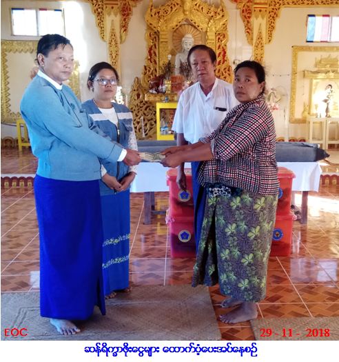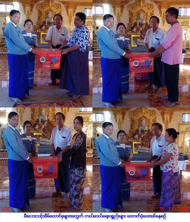 လူမှုဝန်ထမ်း၊ ကယ်ဆယ်ရေးနှင့် ပြန်လည်နေရာချထားရေးဝန်ကြီးဌာန၊ ဘေးအန္တရာယ်ဆိုင်ရာစီမံခန့်ခွဲမှုဦးစီးဌာန၊ ဧရာဝတီတိုင်း ဒေသကြီးဦးစီးမှူးရုံးမှ တာဝန်ရှိသူများသည် ဧရာဝတီတိုင်းဒေသကြီး၊ ပုသိမ်ခရိုင်၊ ပုသိမ်မြို့နယ်၊ ရွှေမြင်တင်ကျေးရွာအုပ်စု၊ ရွှေမြင်တင်ကျေးရွာ၊ အမှတ် (၄) အထပ်သားစက်ရုံ၌ (၂၉-၁၁-၂၀၁၈) ရက်နေ့တွင် ဖြစ်ပွားခဲ့သော မီးဘေးကြောင့် မီးလောင် ကျွမ်းပျက်စီးခဲ့သည့် ဝန်ထမ်းလိုင်းခန်း (၃) ခန်းတွဲ (၂) ထပ် (၁) လုံးမှ အိမ်ထောင်စု (၅) စုရှိ လူဦးရေ (၂၀) ဦးအတွက် ကယ်ဆယ်ရေးပစ္စည်း (၁၆) မျိုး (၅) အိမ်ထောင်စာနှင့် ဆန်ရိက္ခာဖိုးငွေ (၄၂,၀၀၀/-) ကျပ်တို့အား (၂၉-၁၁-၂၀၁၈) ရက်နေ့၊ (၁၅း၃၀) နာရီအချိန်တွင် သက်ဆိုင်ရာတာဝန်ရှိသူများနှင့်အတူ ဘေးသင့်ပြည်သူများ လက်ဝယ်အရောက် ကွင်းဆင်းထောက်ပံ့ ပေးအပ်ခဲ့ကြောင်း သတင်းရရှိပါသည်။