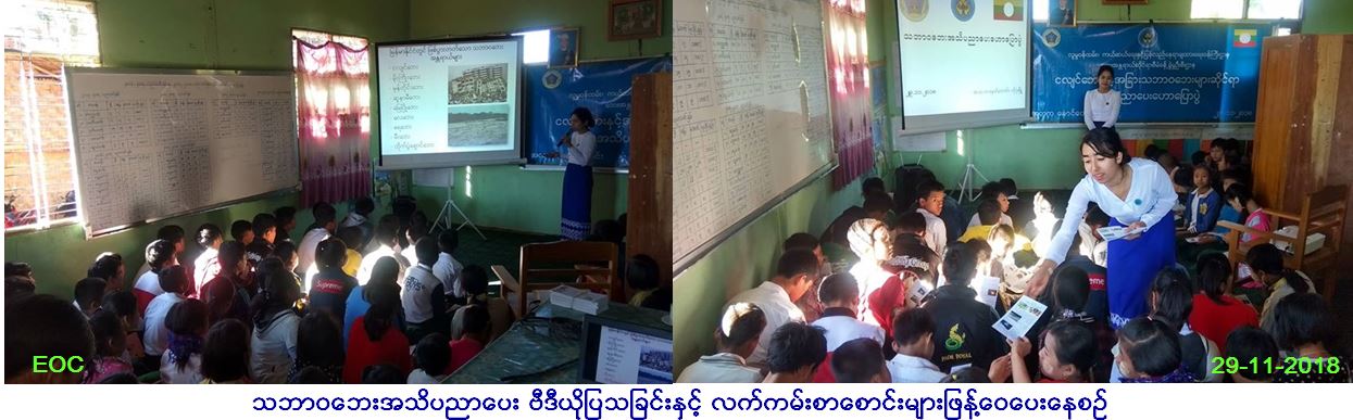 လူမှုဝန်ထမ်း၊ ကယ်ဆယ်ရေးနှင့် ပြန်လည်နေရာ ချထားရေးဝန်ကြီးဌာန၊ ဘေးအန္တရာယ်ဆိုင်ရာစီမံ ခန့်ခွဲမှုဦးစီးဌာန၊ ရှမ်းပြည်နယ်ဦးစီးမှူးရုံးမှ တာဝန်ရှိသူများသည် (၂၉.၁၁.၂၀၁၈) ရက်နေ့၊ နံနက်ပိုင်းတွင် ဟိုပုံးမြို့ အလက နောင်တောင်းကျောင်း၌ သဘာဝဘေး အသိပညာပေး ဟောပြောပွဲပြုလုပ်ခဲ့ရာ ကျောင်းသား၊ ကျောင်းသူ(၈၀)ဦးတက်ရောက်ခဲ့ပြီး ရာသီဥတုပြောင်းလဲမှုဖြစ်စဉ်များ၊ သဘာဝဘေးအန္တရာယ်များ ဖြစ်ပွားလာမှုနှင့် ငလျင်ဘေး၊ ရေဘေး၊ မိုးကြိုးဘေး၊ လေပြင်းဘေးနှင့် အခြားသဘာဝဘေးများအတွက် ဆောင်ရန်/ ရှောင်ရန်အချက်များအား ဟောပြောခြင်း၊ သဘာဝဘေးဆိုင်ရာအသိပညာပေးဗီဒီယိုပြသခြင်း လက်ကမ်းစာစောင်များပေးဝေခြင်းများပြုလုပ်ခဲ့ကြောင်း သတင်းရရှိပါသည်။