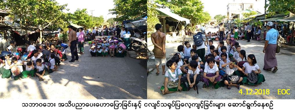 လူမှုဝန်ထမ်း၊ ကယ်ဆယ်ရေးနှင့် ပြန်လည်နေရာချထားရေးဝန်ကြီးဌာန၊ ဘေးအန္တရာယ်ဆိုင်ရာ စီမံခန့်ခွဲမှုဦးစီးဌာန၊ ဘိုကလေးမြို့နယ်ဦးစီးမှူးရုံးမှ တာဝန်ရှိသူများသည် ဘိုကလေးမြို့နယ်၊ အမှတ် (၂) ရပ်ကွက်၊ အခြေခံပညာ မူလတန်းကျောင်း (စက်ကုန်း)၌ (၄-၁၂-၂၀၁၈) ရက်နေ့၊ နေ့လယ် (၁း၀၀) နာရီအချိန်တွင် သဘာဝဘေး အသိပညာပေးဟောပြောခြင်းနှင့် ငလျင်သရုပ်ပြလေ့ကျင့်ခြင်းများ ဆောင်ရွက်ခဲ့ရာ အဆိုပါအခမ်းအနား၌ မြို့နယ်မီးသတ်ဦးစီးဌာန၊ မြို့နယ်ကျန်းမာရေးဦးစီးဌာန၊ ကျောင်းအုပ်ဆရာကြီးနှင့် ဆရာ/ဆရာမများ၊ မြို့နယ်ကြက်ခြေနီသူနာပြုတပ်ဖွဲ့၊ စေတနာ့ဝန်ထမ်းလူငယ်အဖွဲ့များ၊ ရပ်ကွက်အုပ်ချုပ်ရေးမှူးနှင့် ရပ်မိ/ရပ်ဖများ၊ ပြည်သူစစ်၊ အရန်မီးသတ်တပ်ဖွဲ့ဝင်များ၊ ကျောင်းသား/သူ၊ စုစုပေါင်း (၃၅၀) ဦးခန့် တက်ရောက်ခဲ့ပါကြောင်း သတင်းရရှိပါသည်။