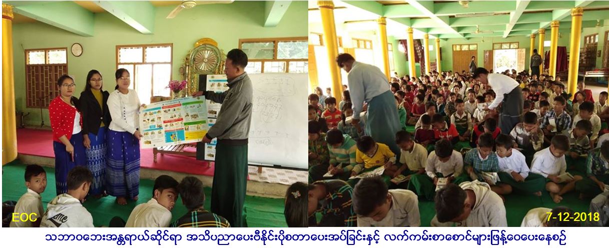 လူမှုဝန်ထမ်း၊ ကယ်ဆယ်ရေးနှင့် ပြန်လည်နေရာချ ထားရေးဝန်ကြီးဌာန၊ ဘေးအန္တရာယ်ဆိုင်ရာစီမံ ခန့်ခွဲမှုဦးစီးဌာန၊ စစ်ကိုင်းတိုင်းဒေသကြီး ဦးစီးမှူးရုံးမှ တာဝန်ရှိသူများသည် (၇.၁၂.၂၀၁၈)ရက်နေ့၊ (၀၉း၃၀)နာရီမှ (၁၁း၃၀)နာရီအထိ မုံရွာခရိုင်၊ မုံရွာမြို့နယ်၊ နတ်ကြီးကျွန်းကျေးရွာ၊ အ.လ.က(ခွဲ)ကျောင်း၌ သဘာဝဘေးအန္တရာယ်နှင့် စပ်လျဉ်း၍ အသိပညာဗဟုသုတများရရှိစေရန် ကျောင်းသား၊ ကျောင်းသူ(၂၅၇)ဦးအား သဘာဝဘေးအန္တရာယ်ဆိုင်ရာ အသိပညာပေးဟောပြောဆွေးနွေးခြင်းဆောင်ရွက်