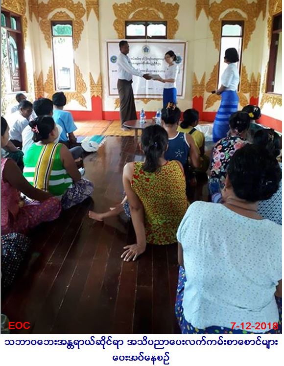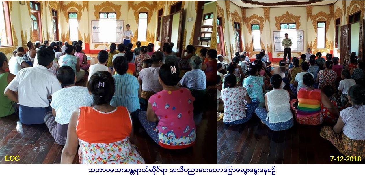 လူမှုဝန်ထမ်း၊ ကယ်ဆယ်ရေးနှင့် ပြန်လည်နေရာချထားရေးဝန်ကြီးဌာန၊ ဘေးအန္တရာယ်ဆိုင်ရာစီမံခန့်ခွဲမှုဦးစီးဌာန၊ (၇.၁၂.၂၀၁၈)ရက်နေ့တွင် မွန်ပြည်နယ်ဦးစီးမှူးရုံးမှ ဝန်ထမ်းများနှင့် မုဒုံမြို့နယ်၊ အထွေထွေ အုပ်ချုပ်ရေးဦးစီးဌာနမှ ဒုတိယမြို့နယ်အုပ်ချုပ်ရေးမှူး တို့သည် မုဒုံမြို့နယ်၊ ဘလောက်ညောင်ဝိုင်းကျေးရွာ၊ ဘုန်းကြီးကျောင်းဓမ္မာရုံတွင် (၁၀း၀၀)နာရီမှ (၁၂း၀၀)အထိ သဘာဝဘေးအန္တရာယ်ဆိုင် ရာကြိုတင် ပြင်ဆင်ခြင်း၊ ကြိုတင်ကာကွယ်ခြင်း၊ အသိပညာပေးဟောပြောဆွေးနွေးခြင်းအား ကျေးရွာနေပြည်သူ (၁၅၀)ဦးဖြင့် ဟောပြောဆွေးနွေး ခဲ့ပါ ကြောင်း သတင်းရရှိပါသည်။