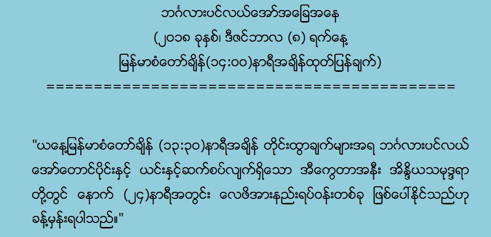 “ယနေ့မြန်မာစံတော်ချိန် (၁၃:၃၀)နာရီအချိန် တိုင်းထွာချက်များအရ ဘင်္ဂလားပင်လယ် အော်တောင်ပိုင်းနှင့် ယင်းနှင့်ဆက်စပ်လျက်ရှိသော အီကွေတာအနီး အိန္ဒိယသမုဒ္ဒရာတို့တွင် နောက် (၂၄)နာရီအတွင်း လေဖိအားနည်းရပ်ဝန်းတစ်ခု ဖြစ်ပေါ်နိုင်သည်ဟု ခန့်မှန်းရပါသည်။”