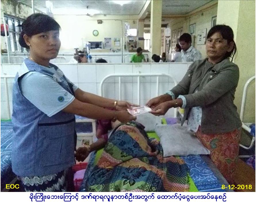 လူမှုဝန်ထမ်း၊ ကယ်ဆယ်ရေးနှင့် ပြန်လည်နေရာချထားရေးဝန်ကြီးဌာန၊ ဘေးအန္တရာယ်ဆိုင်ရာစီမံခန့်ခွဲမှုဦးစီးဌာန၊ မြိတ်ခရိုင်ဦးစီးမှူးရုံးမှ တာဝန်ရှိသူများသည် (၈.၁၂.၂၀၁၈)ရက်နေ့ နံနက်(၃း၁၅)နာရီအချိန်တွင် မြိတ်ခရိုင်၊ ကျွန်းစုမြို့နယ်၊ တောပြားကျေးရွာအုပ်စု မင်းခေါင်းဆေး ကျေးရွာလှေဆိပ်အနီး ရပ်နားထားသော ငါးမျှားပိုက်လှေအားမိုးကြိုးပစ်ခဲ့ရာ လှေပေါ်ရှိ မောင်ရဲပိုင်စိုး(၁၇)နှစ်မှာ စက်ကွင်းမိ၍ လည်ပင်းနှင့် ရင်ဘတ်တွင် မီးလောင်ဒဏ်ရာ များရရှိ၍ မြိတ်မြို့ပြည်သူ့ဆေးရုံကြီး၌ တင်ပို့ကုသခံယူနေပါသဖြင့် ဆိုပါဒဏ်ရာရ လူနာအတွက် ဆေးကု သစရိတ် ၅သောင်း အား (၈.၁၂.၂၀၁၈)ရက်နေ့ (၁၆း၀၀)နာရီအချိန်တွင် သွားရောက်ထောက်ပံ့ပေးခဲ့ကြောင်း သတင်းရရှိပါသည်။