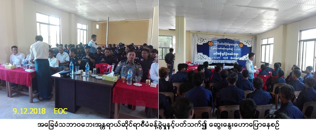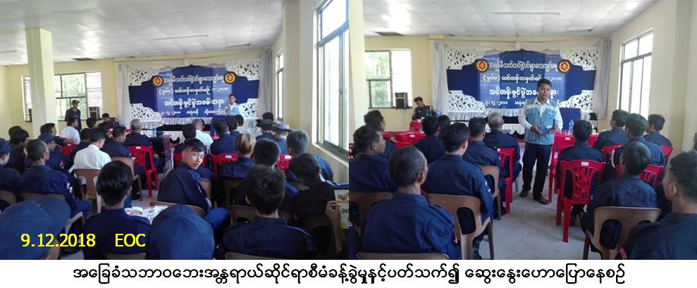 လူမှုဝန်ထမ်း၊ ကယ်ဆယ်ရေးနှင့် ပြန်လည်နေရာချထားရေးဝန်ကြီးဌာန၊ ဘေးအန္တရာယ်ဆိုင်ရာစီမံခန့်ခွဲမှုဦးစီးဌာန၊ ဘိုကလေးမြို့နယ်ဦးစီးမှူးရုံးမှ တာဝန်ရှိသူများသည် (၉-၁၂-၂၀၁၈) ရက်နေ့၊ နံနက် (၁၀း၀၀) နာရီအချိန်တွင် ဘိုကလေးမြို့နယ်၊ ကဒုံကနိကျေးရွာအုပ်စု၊ ကဒုံကနိကျေးရွာ၊ ကဒုံကနိနယ်မြေမီးသတ်စခန်း၊ အရန်မီးသတ်တပ်ဖွဲ့ဝင်များ လေ့ကျင့်ရေးမွမ်းမံသင်တန်း (၁/၂၀၁၈) ဖွင့်ပွဲအခမ်းအနား၌ အခြေခံသဘာဝဘေး အန္တရာယ်ဆိုင်ရာစီမံခန့်ခွဲမှုနှင့်ပတ်သက်၍ ထည့်သွင်းဆွေးနွေးဟောပြောခြင်းကို ဆောင်ရွက်ခဲ့ရာ အဆိုပါ အခမ်းအနား၌ မြန်မာနိုင်ငံရဲတပ်ဖွဲ့ နယ်မြေစခန်းမှူး၊ ကျေးရွာအုပ်စု အုပ်ချုပ်ရေးမှူး၊ ရပ်မိ/ရပ်ဖများ၊ မြို့နယ်မီးသတ်ဦးစီးမှူးနှင့် သင်တန်းသားအရန်မီးသတ်တပ်ဖွဲ့ဝင်များ စုစုပေါင်းအင်အား (၆၅) ဦးခန့် တက်ရောက် ခဲ့ပြီး တက်ရောက်လာသူများအား လက်ကမ်းစာဆောင်များ ဖြန့်ဝေပေးခဲ့ကြောင်းသတင်းရရှိပါသည်။