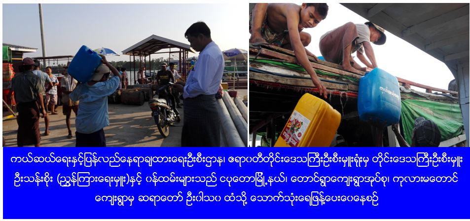 ဦးစီးမှူး ဦးသန်းစိုး(ညွှန်ကြားရေးမှူး)နှင့် ဝန်ထမ်းများမှ ၂၁-၄-၂၀၁၆ ရက်နေ့တွင် အောင်သန်းညွှန့် (၁) သင်္ဘောဖြင့် (၈) ဂါလံဆံ့ ရေပုံး (၅၀) ပုံး၊ ဂါလံ (၄၀၀) အား ဖြန့်ဝေပေးပြီးဖြစ်ပါသည်။