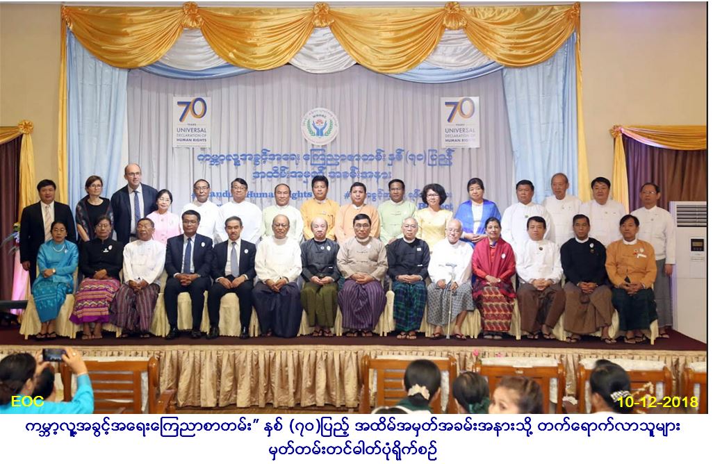 မြန်မာနိုင်ငံအမျိုးသားလူ့အခွင့်အရေးကော်မရှင်က ဦးဆောင်ကျင်းပသော ကမ္ဘာ့လူ့အခွင့်အရေး ကြေညာစာတမ်း (Universal Declaration of Human Rights -UDHR) နှစ် (၇၀)ပြည့် အထိမ်းအမှတ် အခမ်းအနားကို ယနေ့နံနက်ပိုင်းတွင် ရန်ကုန်မြို့ရှိ အပြည်ပြည်ဆိုင်ရာစီးပွားရေးဗဟိုဌာန (IBC)၌ ကျင်းပရာ ပြည်ထောင်စုဝန်ကြီးဒေါက်တာဝင်းမြတ်အေး တက်ရောက်အမှာစကားပြောကြားခဲ့ပါသည်။