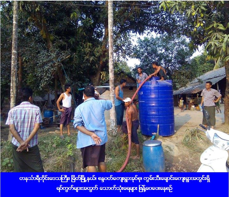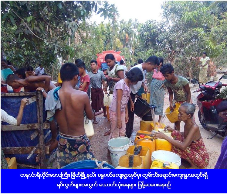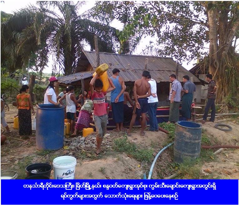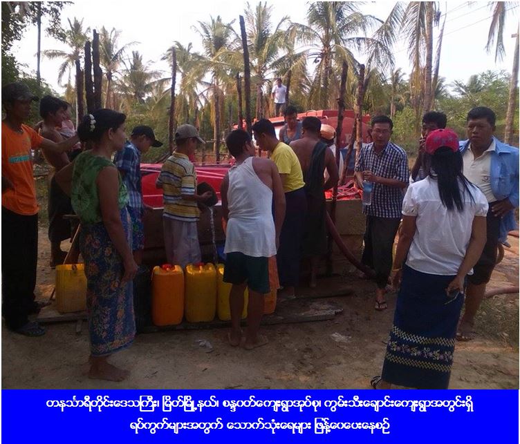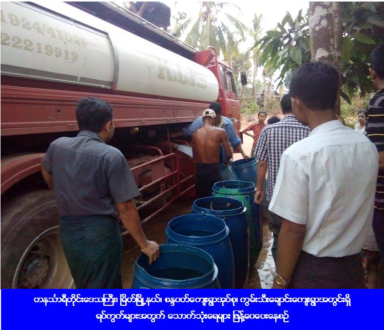 ကယ်ဆယ်ရေးနှင့် ပြန်လည်နေရာချထားရေးဦးစီးဌာန၊ မြိတ်ခရိုင်ဦးစီးမှူးရုံးမှ တာဝန်ရှိသူများသည် ကလွင်ကျေးရွာ တာဝန်ရှိသူများနှင့် ပူးပေါင်း၍ (၂၁-၄-၂၀၁၆) ရက်နေ့တွင် မြိတ်မြို့နယ်၊ စန္ဒဝတ်ကျေးရွာအုပ်စု၊ ကွမ်းသီးချောင်းကျေးရွာအတွင်းရှိ ရပ်ကွက်များအတွက် ရေဂါလံပေါင်း (၃၈၀၀) ကို သွားရောက် ဖြန့်ဝေပေးခဲ့ကြောင်း သိရှိရပါသည်။