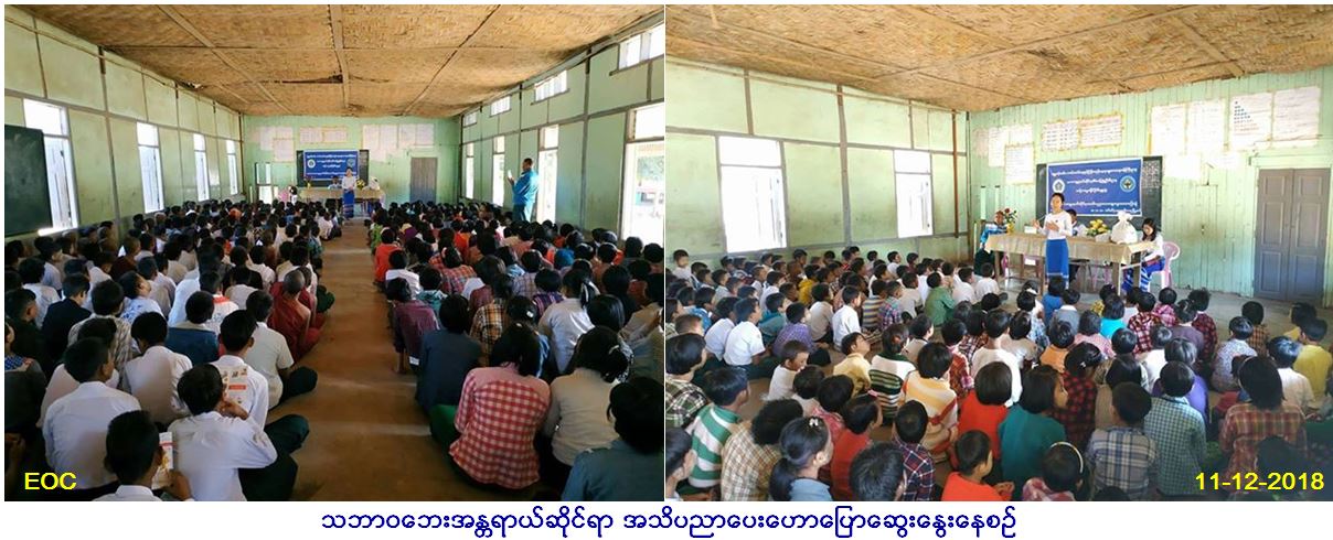 လူမှုဝန်ထမ်း၊ ကယ်ဆယ်ရေးနှင့် ပြန်လည်နေရာ ချထားရေးဝန်ကြီးဌာန၊ ဘေးအန္တရာယ်ဆိုင်ရာစီမံ ခန့်ခွဲမှုဦးစီးဌာန၊ ကန့်ဘလူခရိုင်ဦးစီးမှူးရုံးမှ တာဝန်ရှိသူများသည် (၁၁-၁၂-၂၀၁၈) ရက်နေ့၊ (၁၀း၀၀)နာရီမှ (၁၂း၀၀)နာရီအထိ ကန့်ဘလူခရိုင်၊ ကန့်ဘလူမြို့နယ်၊ အ-လ-က (စံပါယ်နံ့သာ)ရှိ ကျောင်းသူ/ကျောင်းသား(၃၈၀)ဦးတို့အား သဘာဝဘေးအန္တရာယ်လျော့ပါးရေး အသိပညာပေးဟောပြောဆွေးနွေးခြင်း၊ သရုပ်ပြခြင်းများပြုလုပ်ခဲ့ပြီး လက်ကမ်းစာစောင်များ လည်းဖြန့်ဝေခဲ့ပေးခဲ့ကြောင်း သတင်းရရှိပါသည်။