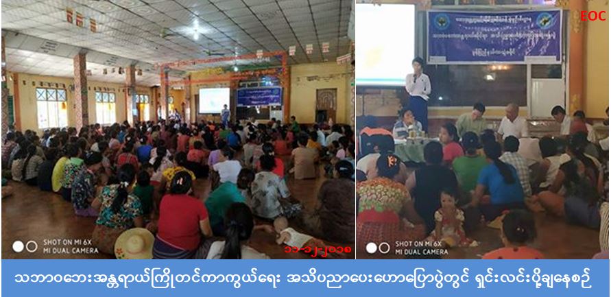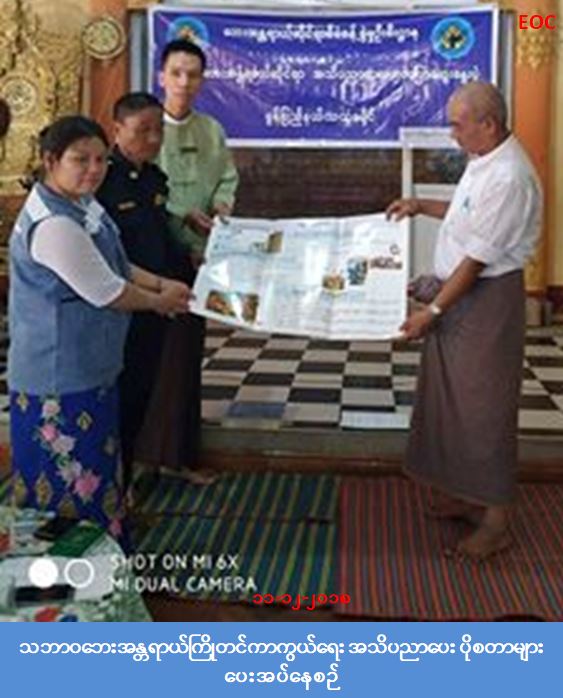 လူမှုဝန်ထမ်း၊ ကယ်ဆယ်ရေးနှင့် ပြန်လည်နေရာချထားရေးဝန်ကြီးဌာန၊ ဘေးအန္တရာယ်ဆိုင်ရာ စီမံခန့်ခွဲမှု ဦးစီးဌာန၊ မွန်ပြည်နယ်၊ သထုံခရိုင်၊ ကျိုက်ထိုမြို့နယ်ဦးစီးမှူးရုံးမှ တာဝန်ရှိသူများသည် (၁၁-၁၂-၂၀၁၈) ရက်နေ့ တွင် ကော့စံနိုင်ရပ်ကွက်၊ တောရဘုန်းကြီးကျောင်း၌ လူဦးရေ (၃၅၀) ဦးခန့်အား မြို့နယ်သဘာဝဘေးကော်မတီ အဖွဲ့ဝင်များနှင့်ပူးပေါင်း၍သဘာဝဘေးအန္တရာယ်ကြိုတင် ကာကွယ်ရေး အသိပညာပေးဟောပြောပွဲကျင်းပခဲ့ပြီး လက်ကမ်းစာစောင်များလည်း ဖြန့်ဝေပေးခဲ့ကြောင်း သိရှိရပါသည်။