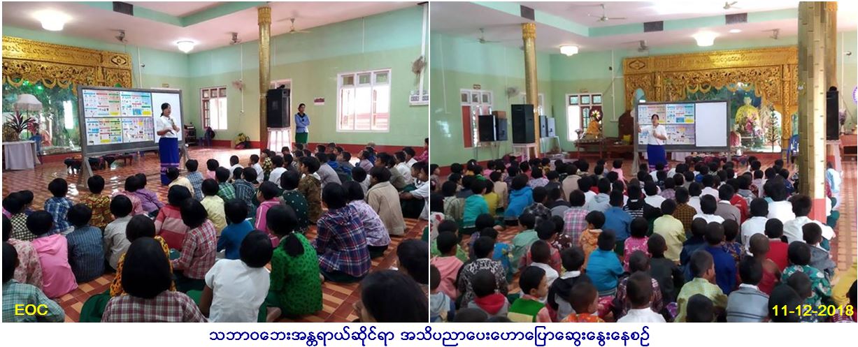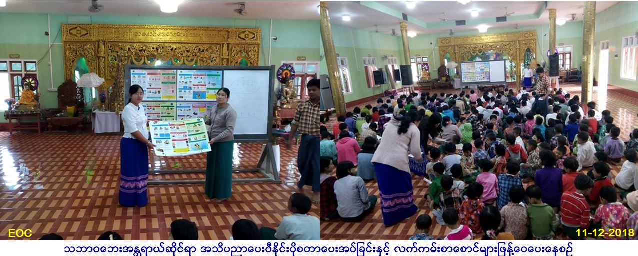 လူမှုဝန်ထမ်း၊ ကယ်ဆယ်ရေးနှင့် ပြန်လည်နေရာချထားရေးဝန်ကြီးဌာန၊ ဘေးအန္တရာယ်ဆိုင်ရာစီမံခန့်ခွဲမှုဦးစီးဌာန၊ စစ်ကိုင်းတိုင်းဒေသကြီး တိုင်းဒေသကြီးဦးစီးမှူးရုံးမှ ဒေါ်သန်းသန်းဝင်း လက်ထောက်ညွှန်ကြားရေးမှူး မှဦးဆောင်ပြီး (၁၁-၁၂-၂၀၁၈)ရက်နေ့၊ (၁၀း၀၀)နာရီမှ (၁၁း၀၀)နာရီအချိန်ထိ မုံရွာမြို့နယ်၊ ဇီးဖြူကုန်းကျေးရွာ အလက(ခွဲ) ကျောင်းတွင် ဆရာ/ဆရာမနှင့် ကျောင်းသူ/သား (၂၁၅)ဦးတို့အား သဘာဝဘေးအန္တရာယ်နှင့်ပတ်သက်၍ ဆောင်ရန်၊ ရှောင်ရန်အချက်များဟောပြောခြင်း၊ လက်ကမ်းစာစောင်များဖြန့်ဝေခြင်းနှင့် ပိုစတာများ ပေးအပ်ခြင်းများ ဆောင်ရွက်ခဲ့ကြောင်း သတင်းရရှိပါသည်။