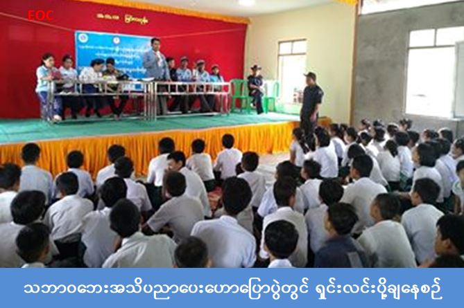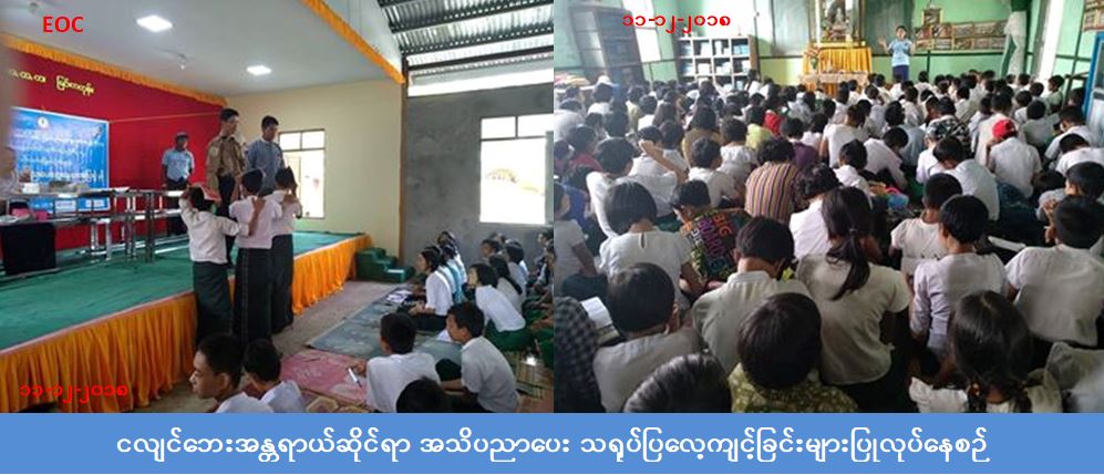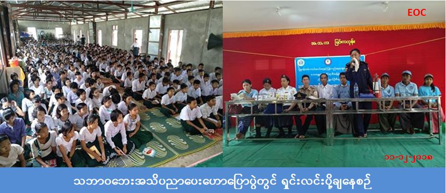 လူမှုဝန်ထမ်း၊ ကယ်ဆယ်ရေးနှင့် ပြန်လည်နေရာချထားရေးဝန်ကြီးဌာန၊ ဘေးအန္တရာယ်ဆိုင်ရာ စီမံခန့်ခွဲမှုဦးစီးဌာန၊ ဧရာဝတီတိုင်းဒေသကြီး၊ ဘိုကလေးမြို့နယ်ဦးစီးမှူးရုံးမှ တာဝန်ရှိသူများသည် (၁၁.၁၂.၂၀၁၈) ရက်နေ့ နံနက်(၁၀:၀၀) နာရီ အချိန်တွင် ဘိုကလေးမြို့နယ်၊ မြင်းကကုန်းကျေးရွာအုပ်စု၊ မြင်းကကုန်းကျေးရွာ၊ အခြေခံပညာအထက်တန်းကျောင်းတွင် သဘာဝဘေးအသိပညာပေးဟောပြောပွဲနှင့် ငလျင်ဘေးအန္တရာယ်သရုပ်ပြလေ့ကျင့်ခြင်းအစီအစဉ်ကို တစ်ကျောင်းလုံး အတိုင်း အတာဖြင့် ကျင်းပဆောင်ရွက်ခဲ့ပြီး ဟောပြောပွဲတွင် ကျေးရွာအုပ်စုအုပ်ချုပ်ရေးမှူးမှ အဖွင့်အမှာစကားပြောကြားကာ နေ့လည်(၁၂:၀၀) နာရီအချိန်တွင် ပထမပိုင်းအစီအစဉ်များ ရပ်နားခဲ့ပါသည်။ နေ့လည်(၁း၀၀) နာရီအချိန် သရုပ်ပြ လေ့ကျင့်ခြင်းအစီအစဉ်ကို ဆက်လက်ကျင်းပခဲ့ရာ မြို့နယ်မီးသတ်ဦးစီးဌာန၊ မြို့နယ်ကျန်းမာရေးဦးစီးဌာန၊ မြို့နယ်ရဲတပ်ဖွဲ့၊ မြို့နယ်ကြက်ခြေနီသူနာပြုတပ်ဖွဲ့၊ စေတနာ့ဝန်ထမ်းလူငယ်အဖွဲ့၊ ကျေးရွာအုပ်စုအုပ်ချုပ်ရေးမှူး၊ ရပ်မိ/ဖများ၊ ကျေးရွာ ပြည်သူ့စစ်များ၊ အရန်မီးသတ်တပ်ဖွဲ့ဝင်များ၊ ကျေးရွာသူ/သားများ၊ ကျောင်းအုပ်ဆရာကြီးနှင့် ဆရာ/မများ၊ ကျောင်းသား/ သူ များ စုစုပေါင်းအင်အား (၁၂၅၀) ခန့်ဖြင့် ကျင်းပပြုလုပ်ခဲ့ကြောင်း သိရှိရပါသည်။