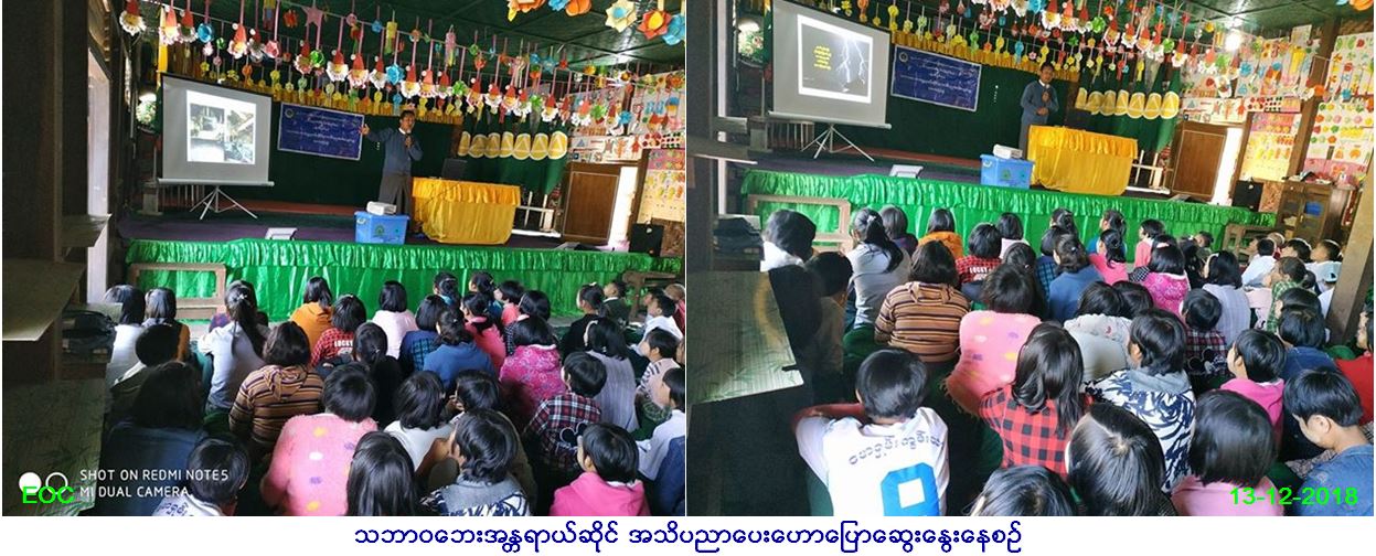 လူမှုဝန်ထမ်း၊ ကယ်ဆယ်ရေးနှင့် ပြန်လည်နေရာချ ထားရေးဝန်ကြီးဌာန၊ ဘေးအန္တရာယ်ဆိုင်ရာစီမံ ခန့်ခွဲမှုဦးစီးဌာန၊ ဘေးအန္တရာယ်ဆိုင်ရာ စီမံခန့်ခွဲမှုဦးစီးဌာန၊ ခန္တီးခရိုင်ဦးစီးမှူးရုံးမှ တာဝန်ရှိသူများသည် (၁၃-၁၂-၂၀၁၈)နေ့၊ (၁၁း၃၀)နာရီအချိန်၌ ခန္တီးမြို့၊ အမှတ်(၄)အခြေခံ ပညာ အထက်တန်းကျောင်းခွဲရှိ ကျောင်းသူ/ကျောင်းသား (၂၁၀)ဦးအား သဘာဝဘေးအန္တရာယ်ဆိုင်ရာ အသိ ပညာပေးဆွေးနွေးဟောပြောပွဲပြုလုပ်ခဲ့ကြောင်း သတင်းရရှိပါသည်။