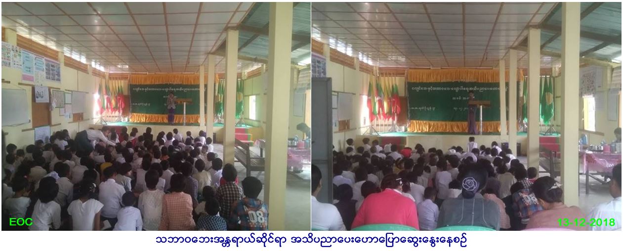 လူမှုဝန်ထမ်း၊ ကယ်ဆယ်ရေးနှင့် ပြန်လည်နေရာချထားရေးဝန်ကြီးဌာန၊ ဘေးအန္တရာယ်ဆိုင်ရာစီမံခန့်ခွဲမှုဦးစီးဌာန၊ သရက်ခရိုင်ဦးစီးမှူးရုံးမှ တာဝန်ရှိသူများသည် (၁၃-၁၂-၂၀၁၈)ရက်နေ့တွင် စမ်းအိုင့်ကျေးရွာအုပ်စု၊ အုတ်ဖိုကျွန်းကျေးရွာရှိ အခြေခံပညာ အလယ်တန်းကျောင်းတွင် ငလျင်ဘေးနှင့် အခြားသဘာဝဘေးအန္တရာယ်များနှင့်ပတ်သက်၍ အသိပညာပေးဟောပြောပွဲပြုလုပ်ဆောင်ရွက်ခဲ့ပါသည်။ အဆိုပါ ဟောပြောပွဲ တွင် ဦးစီးဌာန၏ လုပ်ငန်းတာဝန်များ၊ ရည်ရွယ်ချက်များ၊ ဘေး (၈) မျိုး ဆောင်ရန်/ရှောင်ရန်များ၊ ငလျင်ဘေးနှင့်ပတ်သက်၍ လက်တွေ့သရုပ်ပြခြင်း၊ လက်တွေ့ပါဝင်ဆောင် ရွက်စေခြင်း၊ အသိပညာပေးလက်ကမ်း စာစောင်များနှင့် ဗလာ စာအုပ်များ ဖြန့်ဝေပေးခဲ့ပြီး ဆရာ/မနှင့် ကျောင်းသား/သူ၊ စုစုပေါင်း (၁၅၀)ဦးအား တက်ရောက်ခဲ့ကြောင်း သတင်းရရှိပါသည်။