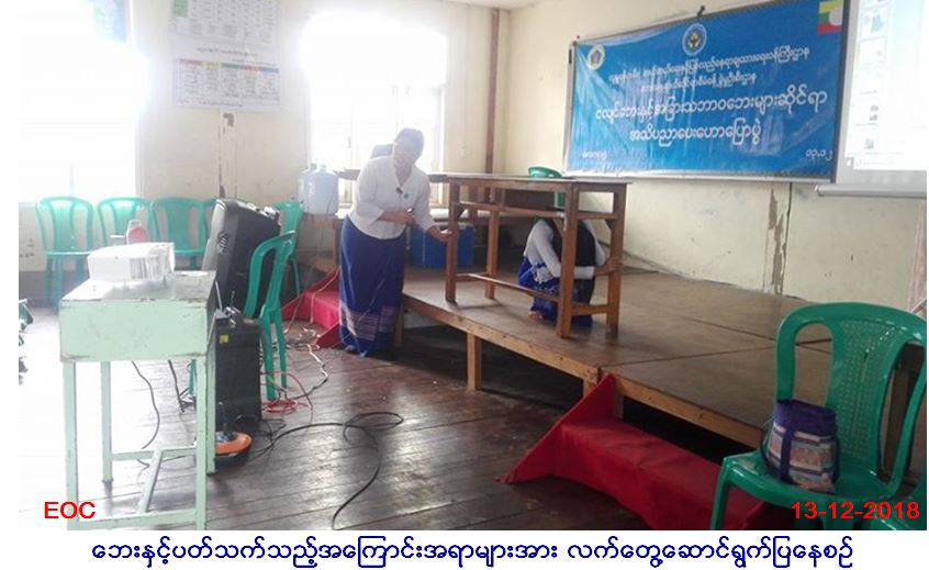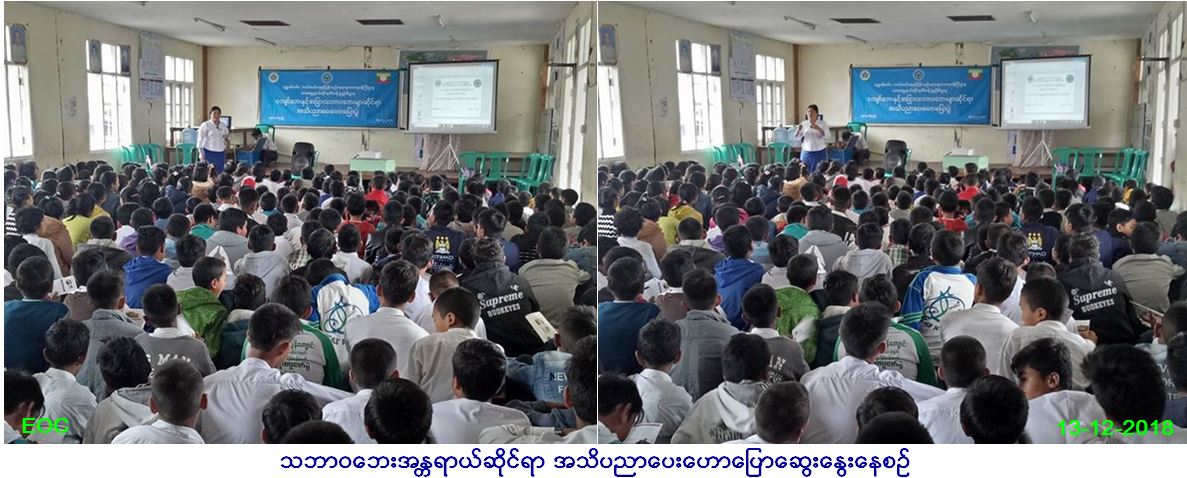 လူမှုဝန်ထမ်း၊ ကယ်ဆယ်ရေးနှင့် ပြန်လည်နေရာချ ထားရေးဝန်ကြီးဌာန၊ ဘေးအန္တရာယ်ဆိုင်ရာစီမံ ခန့်ခွဲမှုဦးစီးဌာန၊ ရှမ်းပြည်နယ်ဦးစီးမှူးရုံးမှ တာဝန်ရှိသူများသည် (၁၃.၁၂.၂၀၁၈)ရက်နေ့၊ ညနေပိုင်းတွင် တောင်ကြီးမြို့နယ်မြို့ပေါ်ကျောင်း အ.လ.က(၁၅)၌ သဘာဝဘေး အသိပညာ ပေးဟောပြောပွဲပြုလုပ်ခဲ့ရာကျာင်းသား/သူ(၂၈၀)ဦးတက်ရောက်ခဲ့ပြီး ရာသီဥတုပြောင်းလဲမှုဖြစ်စဉ်များ၊ သဘာဝဘေးအန္တရာယ်များဖြစ်ပွားလာ မှုနှင့် ငလျင်ဘေး၊ ရေဘေး၊ မိုးကြိုးဘေး၊ လေပြင်းဘေးနှင့် အခြားသဘာဝဘေးများအတွက် ဆောင်ရန်/ ရှောင်ရန်အချက်များအား ဟောပြော ခြင်း၊ သဘာဝဘေးဆိုင်ရာ အသိပညာပေးဗီဒီယိုပြသခြင်း၊ လက်ကမ်းစာစောင်များဖြန့်ဝေခြင်းများဆောင်ရွက်