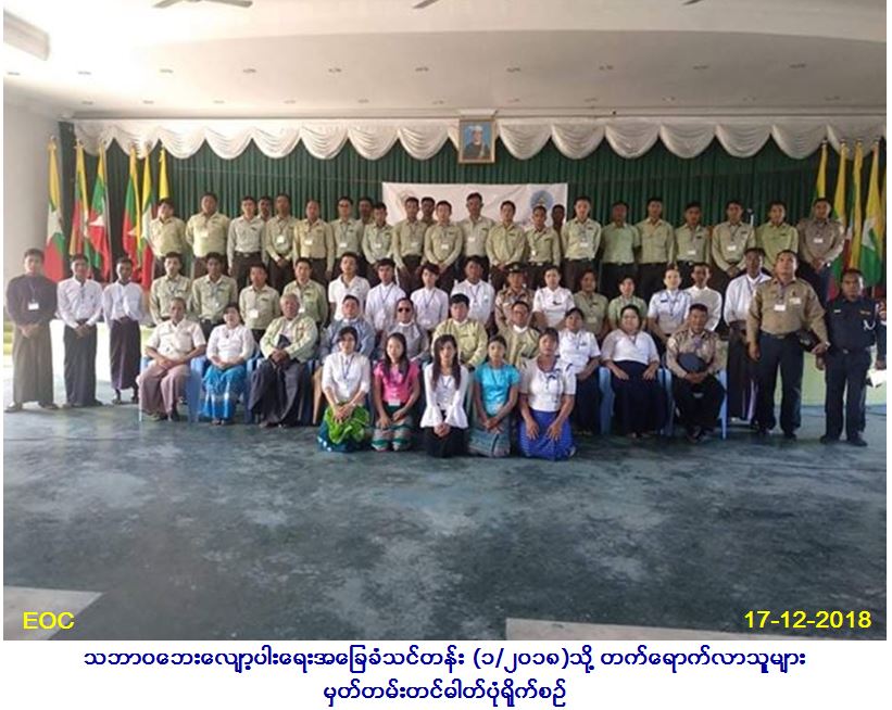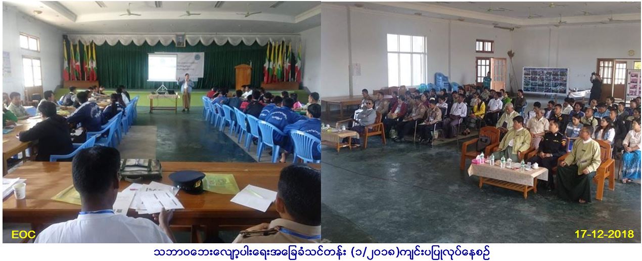 လူမှုဝန်ထမ်း၊ ကယ်ဆယ်ရေးနှင့် ပြန်လည်နေရာချ ထားရေးဝန်ကြီးဌာန၊ ဘေးအန္တရာယ်ဆိုင်ရာစီမံခန့်ခွဲ မှုဦးစီးဌာန၊ ပြည်ထောင်စုနယ်မြေ၊နေပြည်တော်၊ တိုင်းဦးစီးမှူးရုံးမှ တိုင်းဦးစီးမှူးနှင့် တာဝန်ရှိသူများ သည် ဒက္ခိဏခရိုင်အထွေထွေအုပ်ချုပ်ရေးမှူးရုံး၌ (၁၇-၁၂-၂၀၁၈)ရက်နေ့၊ နံနက်(၀၉း၀၀)အချိန်တွင် သဘာဝဘေးလျော့ပါးရေးအခြေခံသင်တန်း (၁/၂၀၁၈)အား သင်တန်းသား၊ သင်တန်းသူ (၅၀)ဦးတို့ဖြင့် ဖွင့်လှစ်ခဲ့ ရာ နေပြည်တော်ကောင်စီ ဝင် ဦးအောင်မြင်ထွန်း၊ တိုင်း/ခရိုင်အဆင့်မှ ဌာနဆိုင်ရာများ အခြားဖိတ်ကြားထားသည့် ဧည့်သည်တော်များတက်ရောက်ခဲ့ပြီး သင်တန်းကာလမှာ (၁၇-၁၂-၂၀၁၈)နေ့မှ (၂၁-၁၂-၂၀၁၈)နေ့အထိ (၅)ရက်တာကြာမြင့်စွာ ကျင်းပသွားမည်ဖြစ်ကြောင်း သတင်းရရှိပါသည်။
