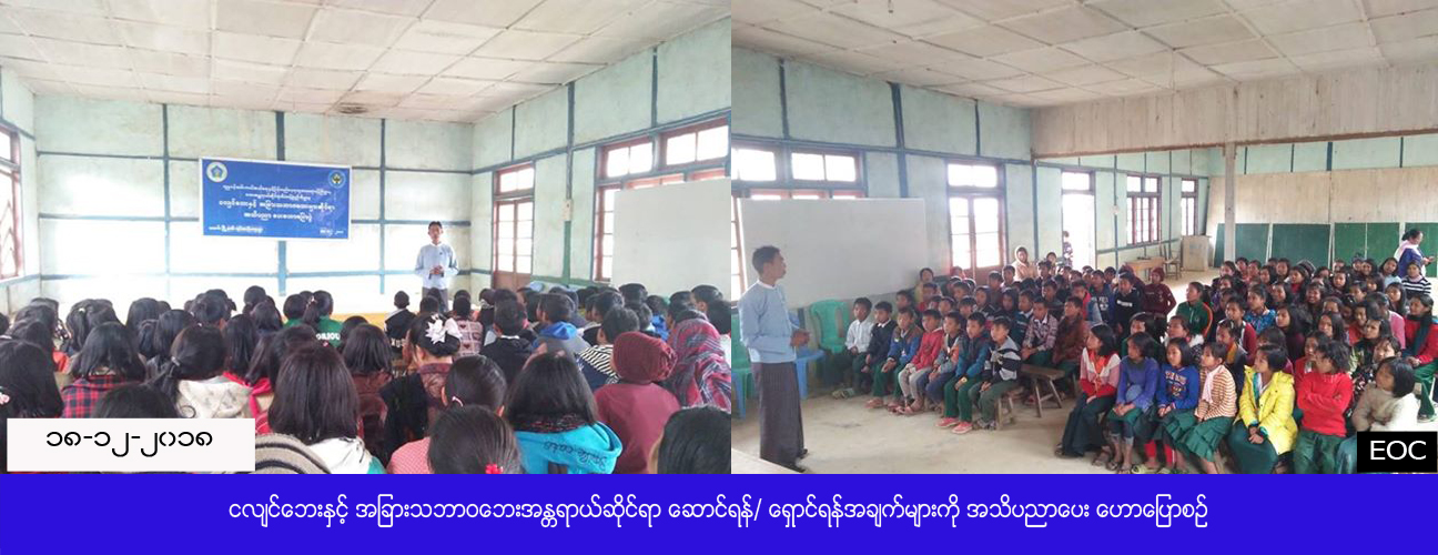 လူမှုဝန်ထမ်း၊ ကယ်ဆယ်ရေးနှင့် ပြန်လည်နေရာချထားရေးဝန်ကြီးဌာန၊ ဘေးအန္တရာယ်ဆိုင်ရာစီမံခန့်ခွဲမှုဦးစီးဌာန၊ ဖလမ်းခရိုင်ဦးစီးမှူးရုံးမှ တာဝန်ရှိသူများသည် (၁၈-၁၂-၂၀၁၈) ရက်နေ့၊ (၁၃း၀၀) နာရီအချိန်မှ (၁၅း၀၀) နာရီအချိန်ထိ ဖလမ်းမြို့နယ်၊ ရမ်ထလိုကျေးရွာရှိ အ.ထ.က ကျောင်း၌ ကျောင်းသား/သူ အင်အား(၁၂၀)ဦးတို့ကို ငလျင်ဘေးအန္တရာယ်ဆိုင်ရာ အသိပညာပေးနှင့် အခြားသဘာဝဘေးအန္တရာယ်ဆိုင်ရာများ၏ ဆောင်ရန်/ရှောင်ရန်အချက်များကို ဟောပြောဆွေးနွေးပြီး တက်ရောက်လာသူတို့အား ဘေး(၈)မျိုးလက်ကမ်းစာစောင်များဖြန့်ဝေခြင်းနှင့် နံရံကပ်ပိုစတာများဖြစ်သည့် မီးဘေး၊ မြေပြိုဘေးနှင့် ငလျင်ဘေးတို့အား ကျောင်းဝင်းအတွင်း ချိန်ဆွဲနိုင်ရေးအတွက် ပေးအပ်ခဲ့ကြောင်း သိရှိရပါသည်။