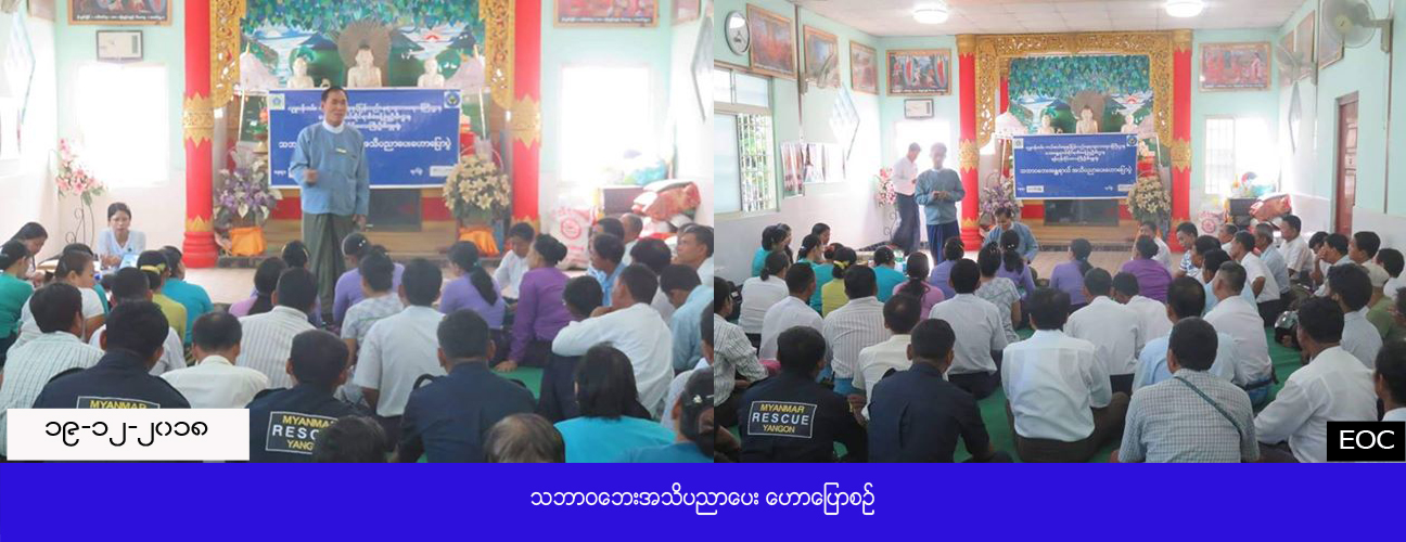 လူမှုဝန်ထမ်း၊ ကယ်ဆယ်ရေးနှင့် ပြန်လည်နေရာချထားရေးဝန်ကြီးဌာန၊ ဘေးအန္တရာယ်ဆိုင်ရာစီမံခန့်ခွဲမှုဦးစီးဌာန၊ ရန်ကုန်တိုင်းဒေသကြီးဦးစီးမှူးရုံးမှ တာဝန်ရှိသူများသည် (၁၉-၁၂-၂၀၁၈) ရက်နေ့၊ (၁၀း၀၀) နာရီအချိန်တွင် မင်္ဂလာဒုံမြို့နယ်၊ ထောက်ကြန့်မြို့၊ နွယ်ခွေကျေးရွာသို့ သွားရောက်၍ ပြည်သူလူထု (၁၀၀) ဦးခန့်တို့အား ငလျင်ဘေးအန္တရာယ်၊ သဘာဝဘေးအန္တရာယ်များနှင့် သက်ဆိုင်သော အသိပညာပေးဟောပြောခြင်းများ ဆောင်ရွက်ခဲ့ပြီး သဘာဝဘေးအသိပညာပေး လက်ကမ်းစာစောင်များ ပေးဝေခဲ့ကြောင်း သိရှိရပါသည်။