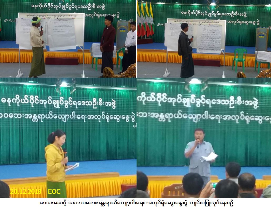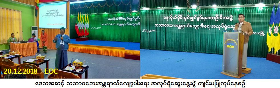 လူမှုဝန်ထမ်း၊ ကယ်ဆယ်ရေးနှင့် ပြန်လည်နေရာချထားရေးဝန်ကြီးဌာန၊ ဘေးအန္တရာယ်ဆိုင်ရာ စီမံခန့်ခွဲမှုဦးစီးဌာန၊ ရှမ်းပြည်နယ်ဦးစီးမှူးရုံးမှ တာဝန်ရှိသူများနှင့် ရှမ်းပြည်နယ်အစိုးရအဖွဲ့တို့ ပူးပေါင်း၍ ဒေသအဆင့် သဘာဝဘေးလျော့ပါးရေး အလုပ်ရုံဆွေးနွေးပွဲကို (၂၀-၁၂-၂၀၁၈) ရက်နေ့၊ (၀၉း၃၀) အချိန်မှ (၁ရး၃၀)အချိန်ထိ ရှမ်းပြည်နယ်၊ ဓနုကိုယ်ပိုင်အုပ်ချုပ်ခွင့်ရဒေသ၊ ပင်းတယမြို့၌ ကျင်းပပြုလုပ်ခဲ့ရာ ဦးစီးအဖွဲ့ဥက္ကဌနှင့်အဖွဲ့ဝင်များ၊ ပင်းတယနှင့် ရွာငံမြို့နယ်များမှ ဌာနဆိုင်ရာများ၊ မြို့မိ/မြို့ဖများ၊ ရပ်/ကျေးအုပ်ချုပ်ရေးမှူးများ၊ လူမှုရေးအဖွဲ့အစည်းများ၊ စုစုပေါင်းလူဦးရေ (၁၃၀) ဦးတက်ရောက်ခဲ့ပြီး အဆိုပါအလုပ်ရုံဆွေးနွေးပွဲ၌ (၂၀၁၉) ခုနှစ်၊ နွေရာသီကာလတွင် ကြုံတွေ့နိုင်သော ရေရှားပါးမှုအခြေအနေအတွက် ကြိုတင် ပြင်ဆင်ဆောင်ရွက်ရန် လိုအပ်မည့်အခြေအနေများအား ဝိုင်းဝန်းဆွေးနွေးခဲ့ပါကြောင်း သတင်းရရှိပါသည်။
