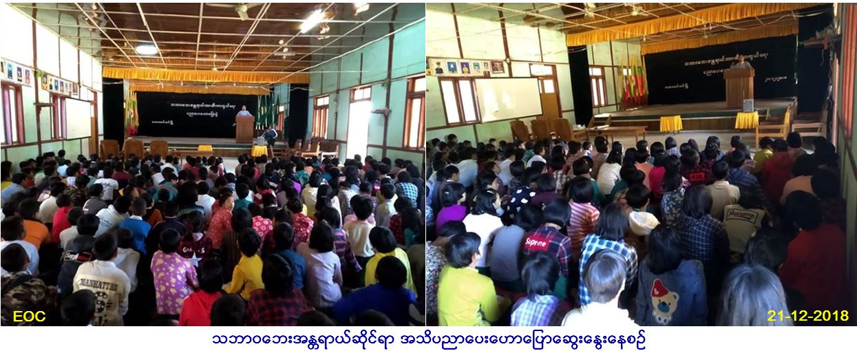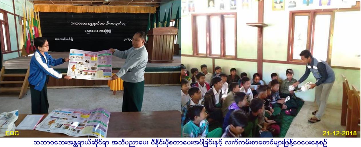 လူမှုဝန်ထမ်း၊ ကယ်ဆယ်ရေးနှင့်ပြန်လည်နေရာချထားရေးဝန်ကြီးဌာန၊ ဘေးအန္တရာယ်ဆိုင်ရာစီမံခန့့်ခွဲမှုဦးစီးဌာန၊ ကလေးခရိုင်ဦးစီးမှူးရုံးမှ ဒုတိယဦးစီးမှူးနှင့်တာဝန်ရှိသူများသည် (၂၁.၁၂.၂၀၁၈)ရက်နေ့ (၀၉း၃၀)နာရီအချိန်တွင် မင်းကင်းမြို့၊ အ.ထ.က အထက်တန်းကျောင်း၌ ကျောင်းသား၊ ကျောင်းသူ စုစုပေါင်း(၂၅၀)ဦးအား သဘာဝဘေးအန္တရာယ်ဆိုင်ရာ အသိပညာပေးဟောပြောဆွေးနွေးခဲ့ပြီး လက်ကမ်းစာစောင် များဖြန့်ဝေပေးခြင်းနှင့် ငလျင်နံရံကပ်ပိုစတာပေးအပ်ခြင်းများဆောင်ရွက်ခဲ့ကြောင်း သတင်းရရှိပါသည်။