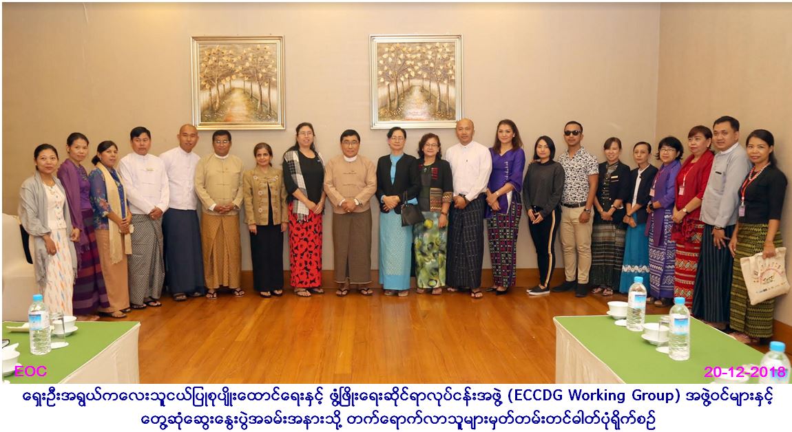 မြန်မာ့ရှေးဦးအရွယ် ကလေးသူငယ်ပြုစုပျိုးထောင်ရေးနှင့်ဖွံ့ဖြိုးရေးဆိုင်ရာ မဟာဗျူဟာမိတ်ဆက်ဖြန့်ချိခြင်းအခမ်းအနားနှင့် အမျိုးသား အဆင့်ဆွေးနွေးပွဲ အခမ်းအနားကျင်းပနိုင်ရေးအတွက် ဝိုင်းဝန်းကူညီဆောင်ရွက်ပေးကြသောအဖွဲ့များအား ဂုဏ်ပြုမှတ်တမ်းလွှာပေးအပ်ခြင်း နှင့် ရှေးဦးအရွယ်ကလေးသူငယ်ပြုစုပျိုးထောင်ရေးနှင့် ဖွံ့ဖြိုးရေးဆိုင်ရာလုပ်ငန်းအဖွဲ့ (ECCDG Working Group) အဖွဲ့ဝင်များနှင့် တွေ့ဆုံ ဆွေးနွေးပွဲ အခမ်းအနားကို ယနေ့နေ့လည်ပိုင်းတွင် နေပြည်တော် Hotel Max ၌ ကျင်းပပြုလုပ်ခဲ့ရာ လူမှုဝန်ထမ်း၊ ကယ်ဆယ်ရေးနှင့် ပြန်လည် နေရာချထားရေးဝန်ကြီးဌာန၊ ပြည်ထောင်စုဝန်ကြီး ဒေါက်တာဝင်းမြတ်အေး တက်ရောက်ခဲ့ပါသည်။