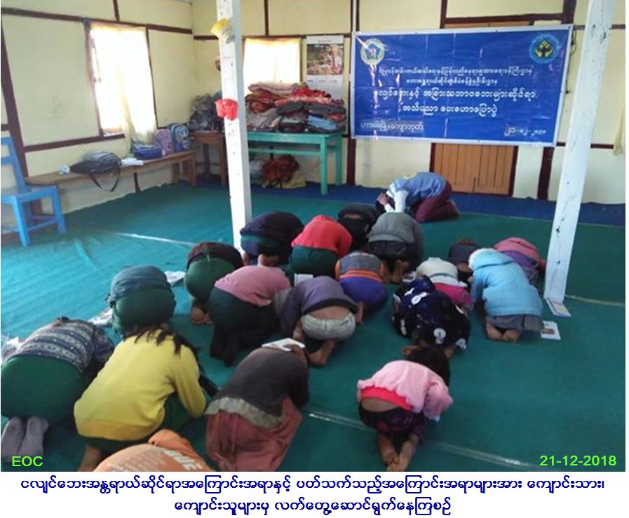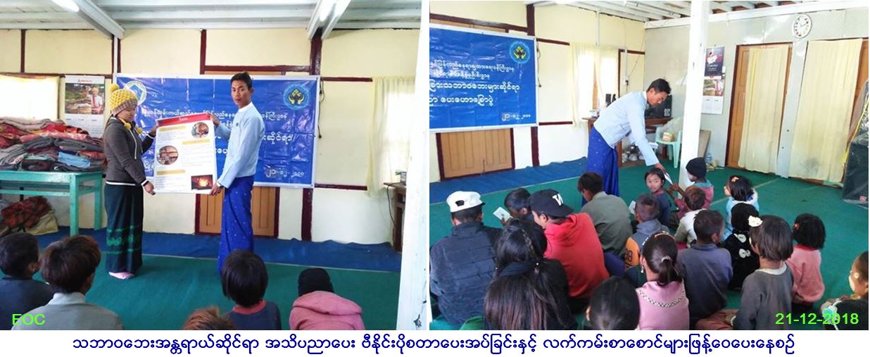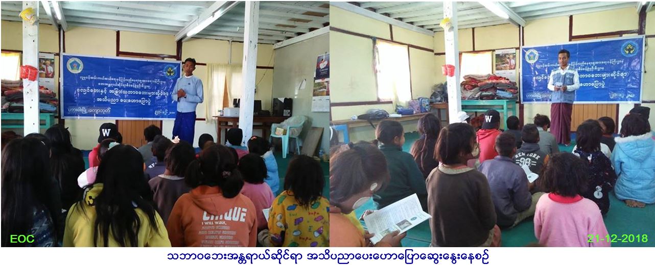 လူမှုဝန်ထမ်း၊ ကယ်ဆယ်ရေးနှင့် ပြန်လည်နေရာချထားရေးဝန်ကြီးဌာန၊ ဘေးအန္တရာယ်ဆိုင်ရာစီမံခန့်ခွဲမှုဦးစီးဌာန၊ ချင်းပြည်နယ်ဦးစီးမှူးရုံး မှ တာဝန်ရှိသူများသည် (၂၁-၁၂-၂၀၁၈)ရက်နေ့ (၁၀း၀၀)အချိန်မှ(၁၁း၃၀)အချိန်ထိ ဟားခါးမြို့၊ ကျောဘုတ်ရပ်ကွက်ရှိ ဘုန်းတော်ကြီးမူလွန် ကျောင်း၌ ကျောင်းသား/သူ အင်အား(၂၅) ဦးတို့အား ငလျင်ဘေးအန္တရာယ်ဆိုင်ရာအသိပညာပေးနှင့် အခြားသဘာဝဘေးအန္တရာယ်ဆိုင်ရာ များဟောပြောဆွေးနွေးခဲ့ပြီး ဘေး(၈)မျိုးလက်ကမ်းစာစောင်များဖြန့်ဝေခြင်းနှင့် နံရံကပ်ပိုစတာပေးအပ်ခြင်းများဆောင်ရွက်ခဲ့ကြောင်း သတင်း ရရှိပါသည်။