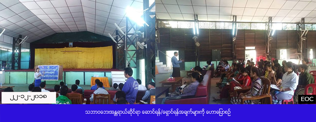 လူမှုဝန်ထမ်း၊ ကယ်ဆယ်ရေးနှင့် ပြန်လည်နေရာချထားရေးဝန်ကြီးဌာန၊ ဘေးအန္တရာယ်ဆိုင်ရာစီမံခန့်ခွဲမှုဦးစီးဌာန၊ ကရင်ပြည်နယ်ဦးစီးမှူးရုံးမှ တာဝန်ရှိသူများသည် (၂၂-၁၂-၂၀၁၈) ရက်နေ့၊ (၀၉း၃၀) နာရီအချိန်တွင် ကရင်ပြည်နယ် သံတောင်မြို့ မသိခန်းမ၌ ပြည်သူလူထု စုစုပေါင်း (၁၀၀) ဦးအား သဘာဝဘေးနှင့်ပတ်သက်သော ဆောင်ရန် ရှောင်ရန်များ အသိပညာပေးဟောပြောပွဲ ပြုလုပ်ခဲ့ပြီး အသိပညာပေး လက်ကမ်း စာစောင်များနှင့် ဗီနိုင်းပိုစတာများ ဝေငှပေးခဲ့ကြောင်း သိရှိရပါသည်။