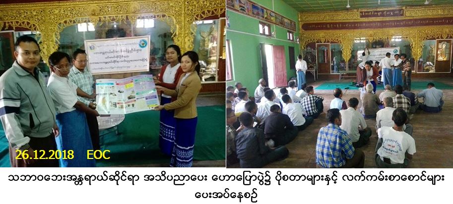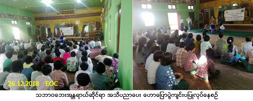 လူမှုဝန်ထမ်း၊ ကယ်ဆယ်ရေးနှင့် ပြန်လည်နေရာချထားရေးဝန်ကြီးဌာန၊ ဘေးအန္တရာယ်ဆိုင်ရာ စီမံခန့်ခွဲမှုဦးစီးဌာန၊ ယင်းမာပင်ခရိုင်ဦးစီးမှူးရုံးမှ တာဝန်ရှိသူများသည် (၂၆-၁၂-၂၀၁၈) ရက်နေ့၊ နေ့လယ် (၂း၀၀) နာရီမှ (၂း၅၀) နာရီအထိ ယင်းမာပင်ခရိုင်၊ ယင်းမာပင်မြို့နယ်၊ စုန်းချောင်းကျေးရွာ၌ သဘာဝဘေးအန္တရာယ်နှင့် စပ်လျဉ်း၍ အသိပညာဗဟုသုတများ ရရှိစေရန်ရည်ရွယ်၍ ရွာသူ/သား (၂၀) ဦးနှင့် ကျောင်းသား/သူ (၁၃၀) ဦးတို့အား သဘာဝဘေးအန္တရာယ်ဆိုင်ရာ အသိပညာပေးဟောပြောဆွေးနွေးခဲြ့ပီး တက်ရောက်လာသူများအား လက်ကမ်း စာစောင်များနှင့် ပိုစတာများဖြန့်ဝေပေးခဲ့ပါကြောင်း သတင်းရရှိပါသည်။