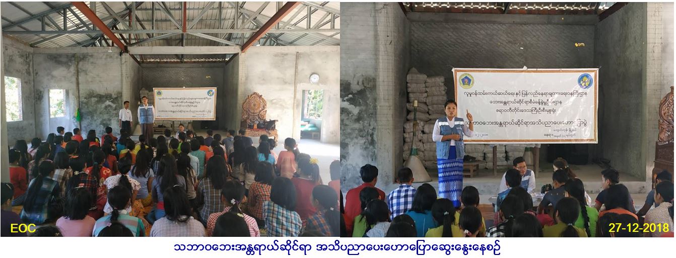 လူမှုဝန်ထမ်း၊ ကယ်ဆယ်ရေးနှင့်ပြန်လည်နေ ရာချထားရေးဝန်ကြီးဌာန၊ ဘေးအန္တရာယ် ဆိုင်ရာစီမံခန့်ခွဲမှုဦးစီးဌာန၊ ဧရာဝတီ တိုင်းဒေသကြီးဦးစီးမှူးရုံးမှ တာဝန်ရှိသူများ သည် (၂၇-၁၂-၂၀၁၈)ရက်နေ့ (၁၄း၀၀)နာရီအချိန်၌ ပုသိမ်ခရိုင်၊ ကျောင်းကုန်းမြို့နယ်၊ အမှတ်(၁)ရပ်ကွက်၊ သင်္ဂဟ ကျောင်းတိုက်(ဓမ္မာရုံ)တွင် ပြည်သူလူထု(၁၆၀)ဦးဖြင့် သဘာဝဘေး အန္တရာယ်ဆိုင်ရာအသိပညာပေး ဟောပြောဆွေးနွေးခဲ့ပြီး တက်ရောက် လာကြသည့် ပြည်သူလူထုအား လက်ကမ်းစာစောင်များနှင့် ဗီနိုင်းပိုစတာများ ဖြန့်ဝေပေးခဲ့ကြောင်း သတင်းရရှိပါသည်။