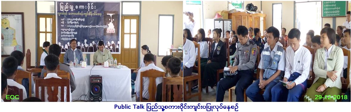 လူမှုဝန်ထမ်း၊ ကယ်ဆယ်ရေးနှင့်ပြန်လည်နေရာချထားရေးဝန်ကြီးဌာန၊ ဘေးအန္တရာယ်ဆိုင်ရာစီမံခန့်ခွဲမှုဦးစီးဌာန၊ ဘေးအန္တရာယ်ဆိုင်ရာစီမံ ခန့်ခွဲမှုဦးစီးဌာန၊ မြဝတီခရိုင်ဦးစီးမှူးရုံးမှ တာဝန်ရှိသူများသည် (၂၉.၁၂.၂၀၁၈) ရက်နေ့၊ နံနက် (၀၉း၃၀)အချိန်၌ မြဝတီမြို့နယ်၊ ဝေါလေ မြိုင်မြို့၊ မြို့အထွေထွေအုပ်ချုပ်ရေးဦးစီးဌာနခန်းမတွင် ပြန်ကြားရေးနှင့်ပြည်သူ ဆက်ဆံရေးဦးစီးဌာနမှ ကျင်းပပြုလုပ်သည့် Public Talk (ပြည်သူ့စကားဝိုင်း) အခမ်းအနားတွင် ပါဝင်ဆွေးနွေးခဲ့ကြသည်။ အခမ်းအနားတွင် မြဝတီခရိုင်ဦးစီးမှူးရုံးမှ လက်ထောက်ညွှန်ကြားရေးမှူးး၊ ဝေါလေမြိုင်မြို့အုပ်ချုပ်ရေးမှူး၊ ဝေါလေမြိုင်မြို့ အခြေခံပညာအလယ်တန်းကျောင်းမှ ကျောင်းအုပ်ဆရာမကြီး၊ ပြန်ကြားရေး နှင့်ပြည်သူဆက်ဆံ ရေးဦးစီးဌာနမှ ဦးစီးအရာရှိတို့မှလူငယ်နှင့် သဘာဝပတ်ဝန်းကျင်ခေါင်းစဉ်ဖြင့် ဦးဆောင်ဆွေးနွေးခဲ့ကြပြီးနောက် တက်ရောက်လာသူ ကျောင်းသား၊ ကျောင်းသူနှင့်ပြည်သူများမှ ပြန်လည်ဆွေးနွေးခဲ့ကြပြီး အခမ်းအနားကို နံနက် (၁၀း၃၀) နာရီတွင် ရုတ်သိမ်းခဲ့သည်။ အခမ်း အနားသို့ ဝေါလေမြိုင်မြို့မှ ဌာနဆိုင်ရာများ ကျောင်းသား၊ ကျောင်းသူများနှင့်ပြည်သူများ စုစုပေါင်း (၅၀) ဦးခန့်တက်ရောက်ခဲ့ကြောင်း သတင်း ရရှိပါသည်။