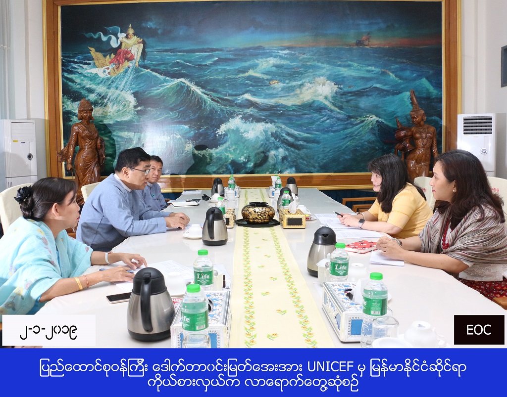 ထိုသို့ဆွေးနွေးရာတွင် မြန်မာနိုင်ငံ၏ အမျိုးသားအဆင့် လူမှုကာကွယ်စောင့်ရှောက်ရေး မဟာဗျူဟာစီမံချက်ပါ လူမှုကာကွယ်စောင့်ရှောက်ရေးလုပ်ငန်းများအား ပြည့်ပြည့်၀၀ အကောင်အထည်ဖော်နိုင်ရေးအတွက် UNICEF နှင့် ပူးပေါင်းဆောင်ရွက်နိုင်မည့် ကိစ္စရပ်များ၊ UNICEF အဖွဲ့အစည်း၏ Executive Director ဖြစ်သူ Ms. Henrietta H. Fore မှ ယခုနှစ် ဇန်နဝါရီလ နှောင်းပိုင်းတွင် မြန်မာနိုင်ငံသို့လာရောက်မည့် ခရီးစဉ်နှင့်ပတ်သက်သော ကိစ္စရပ်များ၊ ဂျပန်နိုင်ငံ၏ ကူညီထောက်ပံ့မှုဖြင့် ရခိုင်ပြည်နယ်၊ ကချင်ပြည်နယ်နှင့် ရှမ်းပြည်နယ်မြောက်ပိုင်းတို့တွင် UNICEF ၊ World Food Programme (WFP)၊ International Organization for Migration (IOM)၊ UNFPA တို့မှ ဆောင်ရွက်မည့် စီမံချက်ဆိုင်ရာကိစ္စရပ်များ၊ ဝန်ကြီးဌာနမှဦးဆောင်၍ ဆောင်ရွက်လျက် ရှိသည့် ကလေးသူငယ် အခွင့်အရေးများဆိုင်ရာဥပဒေ၊ ဆက်လက်ဆောင်ရွက်မည့် Social Assistance နှင့်ပတ်သက်သည့် ဥပဒေဆိုင်ရာကိစ္စရပ်များ၊ ရန်ကုန်မြို့တွင် Social Work Institute တည်ထောင်ဖွင့်လှစ်နိုင်ရန်နှင့် လူ့စွမ်းအားအရင်းအမြစ်ဖွံ့ဖြိုးတိုးတက်ရေး အတွက် ဆောင်ရွက်နိုင်မည့်ကိစ္စရပ်များ၊ မိခင်ဝိုင်းများအား တိုင်းဒေသကြီး/ပြည်နယ် များတွင် တိုးချဲ့ဖွင့်လှစ်နိုင်ရေး၊ ရေရှည်တည်တံ့စေရန် ပူးပေါင်းဆောင်ရွက်နိုင်မည့်ကိစ္စရပ် များနှင့်စပ်လျဉ်း၍ တွေ့ဆုံဆွေးနွေးခဲ့ကြပါသည်။