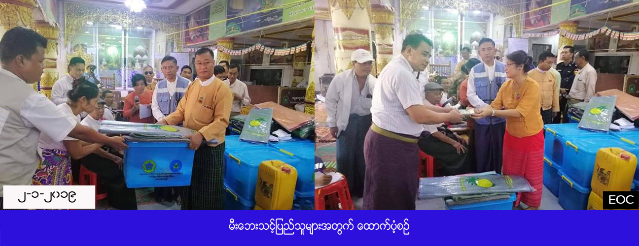 လူမှုဝန်ထမ်း၊ ကယ်ဆယ်ရေးနှင့် ပြန်လည်နေရာချထားရေးဝန်ကြီးဌာန၊ ဘေးအန္တရာယ်ဆိုင်ရာစီမံခန့်ခွဲမှုဦးစီးဌာန၊ ရန်ကုန်တိုင်းဒေသကြီးဦးစီးမှူးရုံးမှ တာဝန်ရှိသူများသည် (၁-၁-၂၀၁၉) ရက်နေ့တွင် ဖြစ်ပွားခဲ့သော ရန်ကုန်တိုင်းဒေသကြီး၊ အင်းစိန်မြို့နယ်၊ စဉ့်ငူရပ်ကွက် (၅)ခန်းတွဲ (၅)လမ်းရှိ ဒေါ်စန်းမြင့်နေအိမ်အပေါ်ထပ်ဘုရားခန်း၌ ဆီမီးပူဇော်စဉ် ဖယောင်းတိုင်မီးလဲကျသွားရာမှတဆင့် မီးစတင်လောင်ကျွမ်းခဲ့မှုကြောင့် မီးလောင်ဆုံးရှုံးခဲ့သည့် နေအိမ်(၁၇)လုံး၊ အိမ်ထောင်စု(၁၈)စုမှ လူဦးရေ(၈၄)ဦးတို့အတွက် အလှူပစ္စည်း 5 litter ရေသန့်(၃၆) ကဒ်၊ ဆီ (၅)ပိဿာ (၃)ပုံး၊ အဝတ်အထည်(၃)အိတ်၊ တိုင်းဒေသကြီးအစိုးရအဖွဲ့မှ စောင်(၃၆)ထည်၊ ကယ်ဆယ်ရေးပစ္စည်း (၁၆)မျိုး (၁၈)အိမ်ထောင်စုစာနှင့် ကလေးကျောင်းဝတ်စုံ (ကျား, မ) ၅ စုံ၊ အိမ်ဆောက်ပစ္စည်းဖိုး (၃,၄၀၀,၀၀၀ိ/-)၊ ဆန်ရိက္ခာ(၇)ရက်စာဖိုး(၁၇၆,၄၀၀ိ/-)အား ပြည်သူ့လွှတ်တော်နှင့် တိုင်းဒေသကြီးမှ လွှတ်တော်ကိုယ်စားလှယ်များ၊ မြို့နယ်အုပ်ချုပ်ရေးအဖွဲ့များနှင့်အတူ ဘေးသင့်ပြည်သူများထံသို့ (၂-၁-၂၀၁၉) ရက်နေ့တွင် ထောက်ပံ့ပေးခဲ့ကြောင်း သိရှိရပါသည်။