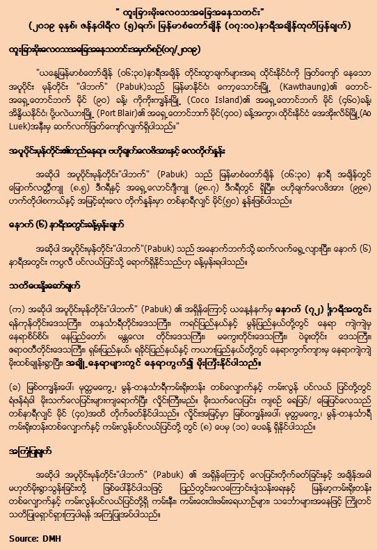 “ယနေ့မြန်မာစံတော်ချိန် (၀၆:၃၀)နာရီအချိန် တိုင်းထွာချက် များအရ ထိုင်းနိုင်ငံကို ဖြတ်ကျော်နေသော အပူပိုင်းမုန်တိုင်း “ပါဘက်” (Pabuk)သည် မြန်မာနိုင်ငံ၊ ကော့သောင်းမြို့ (Kawthaung)၏တောင်-အရှေ့တောင်ဘက် မိုင်(၉၀)ခန့်၊ ကိုကိုး ကျွန်းမြို့ (Coco Island)၏ အရှေ့တောင်ဘက် မိုင်(၄၆၀)ခန့်၊ အိန္ဒိယနိုင်ငံ၊ ပို့ပလဲယားမြို့ (Port Blair)၏ အရှေ့တောင်ဘက် မိုင်(၄၀၀)ခန့်အကွာ၊ ထိုင်းနိုင်ငံ အေအိုးလိခ်မြို့(Ao Luek)အနီးမှ ဆက်လက်ဖြတ်ကျော်လျှက်ရှိပါသည်။”