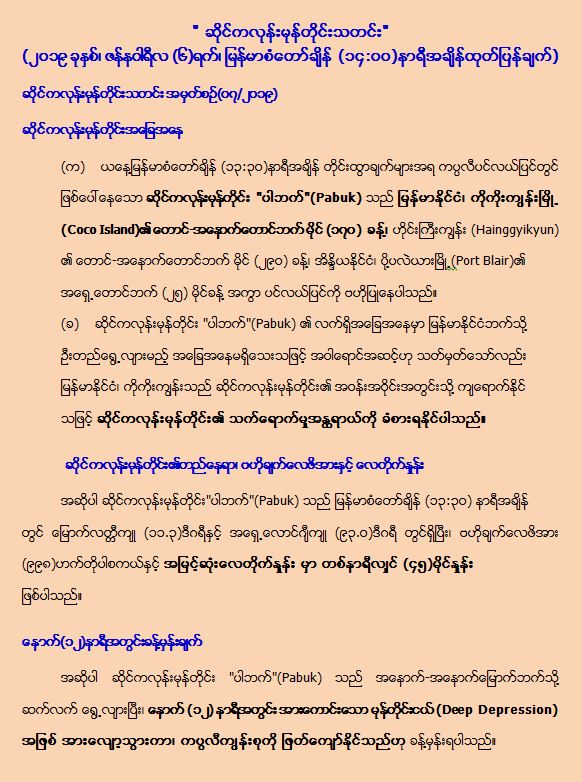 (ခ) ဆိုင်ကလုန်းမုန်တိုင်း “ပါဘက်”(Pabuk)၏ လက်ရှိအခြေအနေမှာ မြန်မာနိုင်ငံ ဘက်သို့ ဦးတည်ရွေ့လျားမည့် အခြေအနေမရှိသေးသဖြင့် အဝါရောင်အဆင့်ဟု သတ်မှတ်သော်လည်း မြန်မာနိုင်ငံ၊ ကိုကိုးကျွန်းသည် ဆိုင်ကလုန်းမုန်တိုင်း၏ အဝန်းအဝိုင်းအတွင်းသို့ ကျရောက်နိုင်သဖြင့် ဆိုင်ကလုန်းမုန်တိုင်း၏ သက်ရောက် မှုအန္တရာယ်ကို ခံစားရနိုင်ပါသည်။
