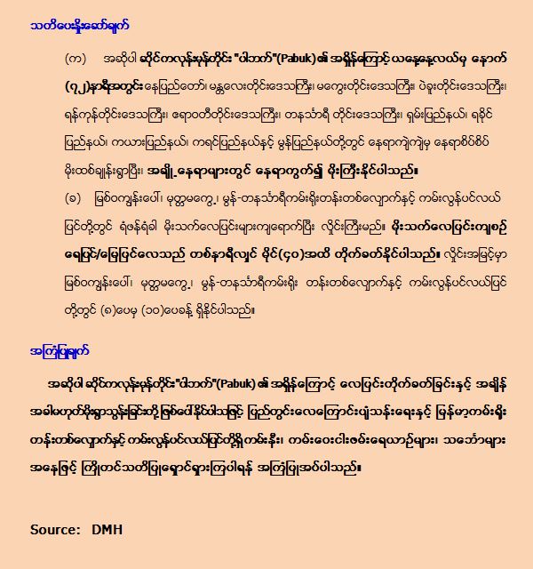 (က) အဆိုပါ ဆိုင်ကလုန်းမုန်တိုင်း “ပါဘက်”(Pabuk)၏ အရှိန်ကြောင့် ယနေ့နေ့လယ်မှ နောက်(၇၂)နာရီအတွင်း နေပြည်တော်၊ မန္တလေးတိုင်းဒေသကြီး၊ မကွေးတိုင်းဒေသကြီး၊ ပဲခူးတိုင်းဒေသကြီး၊ ရန်ကုန်တိုင်းဒေသကြီး၊ ဧရာဝတီတိုင်းဒေသကြီး၊ တနင်္သာရီ တိုင်းဒေသကြီး၊ ရှမ်းပြည်နယ်၊ ရခိုင်ပြည်နယ်၊ ကယားပြည်နယ်၊ ကရင်ပြည်နယ် နှင့် မွန်ပြည်နယ်တို့တွင် နေရာကျဲကျဲမှ နေရာစိပ်စိပ် မိုးထစ်ချုန်းရွာပြီး၊ အချို့နေရာ များတွင် နေရာကွက်၍ မိုးကြီးနိုင်ပါသည်။
