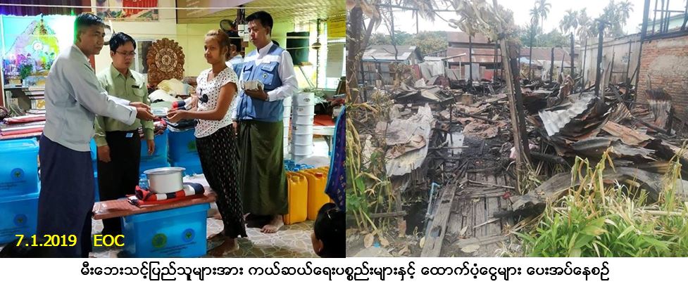 လူမှုဝန်ထမ်း၊ ကယ်ဆယ်ရေးနှင့် ပြန်လည်နေရာချထားရေးဝန်ကြီးဌာန၊ ဘေးအန္တရာယ်ဆိုင်ရာစီမံခန့်ခွဲမှုဦးစီးဌာန၊ရန်ကုန်တိုင်းဒေသကြီးဦးစီးမှူးရုံးမှ တာဝန်ရှိသူများသည် (၄-၁-၂၀၁၉) ရက်နေ့၊ (၁၈း၂၄) နာရီအချိန်တွင် ရန်ကုန်တိုင်းဒေသကြီး၊ မြောက်ဥက္ကလာပမြို့နယ်၊ (ဌ) ရပ်ကွက်၊ ခွာညိုလမ်း၊ အမှတ် (၅၄) ရပ်ကွက် ပိုင်ရှင်ဒေါ်ခင်ကြွယ်နေအိမ်၌ လျှပ်စစ်မီတာဘောက်မှအပူလွန်ကဲပြီး မီးစတင်လောင်ကျွမ်းခဲ့ရာ (သွပ်မိုး၊ ထရံကာ) နေအိမ် (၄) လုံး၊ (သွပ်မိုး၊ပျဉ်ကာ) နေအိမ် (၂) လုံး ၊ အုတ်ညှပ်ပျဉ်ထောင်နှစ်ထပ်တိုက် (၁) လုံး၊ RC တိုက် (၂) လုံး၊ စုစုပေါင်းအိမ်ခြေ (၉) လုံး၊ အိမ်ထောင်စု (၂၀) စုမှ လူဦးရေ (၄၈) ဦးမီးဘေးသင့်ခဲ့ရာ အဆိုပါဘေးသင့်နေအိမ်ရှိ ပြည်သူများအတွက် အိမ်ဆောက်ပစ္စည်းဖိုးထောက်ပံ့ငွေ (၁,၄၀၀,၀၀၀/-) ကျပ်၊ ဆန်ရိက္ခာ (၇) ရက်စာဖိုးထောက်ပံ့ငွေ (၁၀၀,၈၀၀/-) ကျပ်၊ ကယ်ဆယ်ရေးပစ္စည်း (၁၆) မျိုး (၂၀) အိမ်ထောင်စုစာ၊ ကလေးကျောင်းဝတ်စုံ (၆) စုံ၊ စောင်အထည် (၄၀)၊ ဒန်အိုး (၂၀) လုံး၊ ရေသန့် (၅) လီတာ (၄၀) ဗူး၊ ဆီ (၅) ပိဿာ (၃) ပုံး ၊ အဝတ်အထည် (၃) ထုပ်အား ဘေးသင့်ပြည်သူများထံသို့ (၇-၁-၂၀၁၉) ရက်နေ့တွင် သွားရောက်ထောက်ပံ့ပေးအပ်ခဲ့ပါကြောင်း သတင်းရရှိပါသည်။